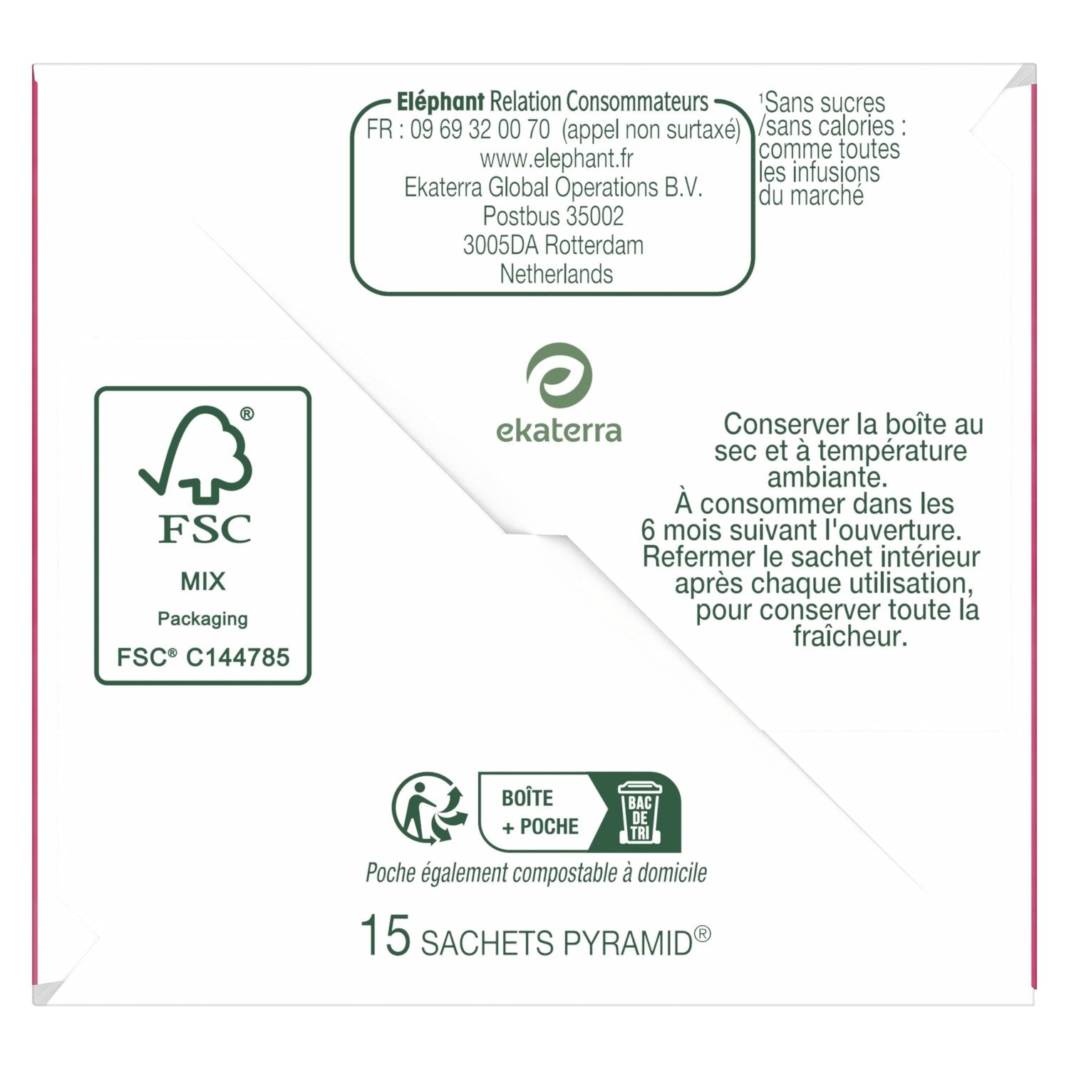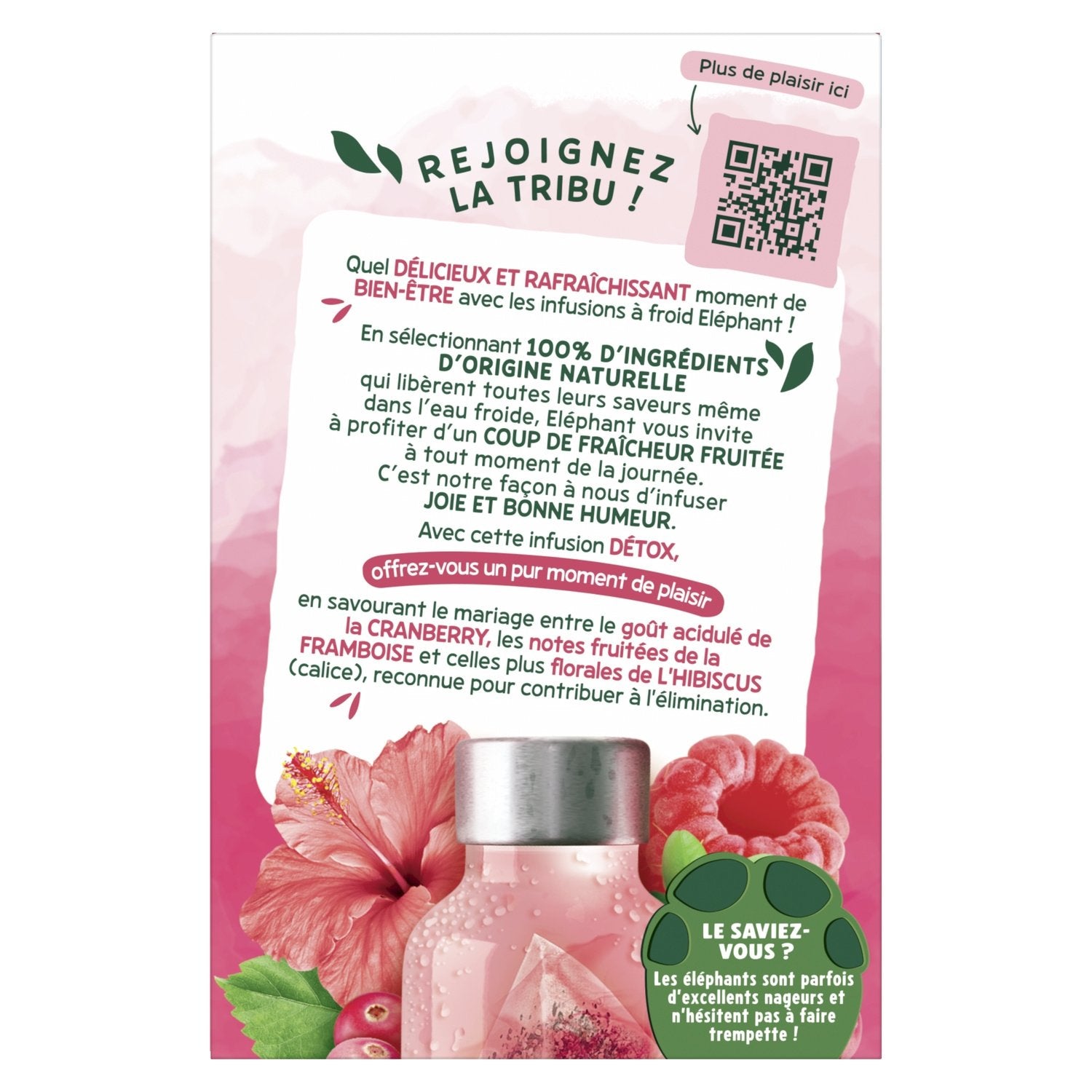 With the 15 Pyramid® Bags of Elephant Cranberry Raspberry Hibiscus Detox Cold Infusion, flavor your water naturally and treat yourself to a delicious and refreshing moment of well-being! With this Detox cold infusion, treat yourself to a moment of pure pleasure by savoring the marriage between the tangy taste of cranberry, the fruity notes of raspberry and the more floral notes of hibiscus (calyx), known to contribute to elimination. By selecting 100% ingredients of natural origin that release all their flavors even in cold water, Elephant invites you to enjoy a burst of fruity freshness at any time of the day. It's our way of infusing joy and good humor. Elephant Cold Infusion recipes are composed exclusively of plants, fruits and natural flavors. They are sugar-free, calorie-free and caffeine-free. Elephant has selected the best plants for you. For an ideal tasting experience, let the Pyramid® infusion bag steep for 5 minutes in 500 ml of cold water, shake, and enjoy! Because we love our planet, no more plastic film. As for our boxes, they are recyclable and made from cardboard from sustainably managed forests. The inner packaging is made from wood pulp that can be composted at home. And our bags? To wrap everyone up, they are plant-based and uncoated. The Elephant adventure began in 1896 and continues today. Which, as far as elephants can remember, makes for quite an experience for an infusion creator... His greatest pleasure, since always, has been to excite our taste buds! Elephant makes listening to nature a real strength, which he uses to choose the best plants and fruits and concoct delicious, unique infusions that are appreciated by all. But make no mistake, Eléphant*, the French people's favorite brand, in its great generosity, also adds kindness, simplicity, a touch of humor, and a touch of originality. So, join the tribe and discover all the other delicious recipes in our Cold Brew range. *Eléphant, value & volume leader in France — Nielsen year 2022