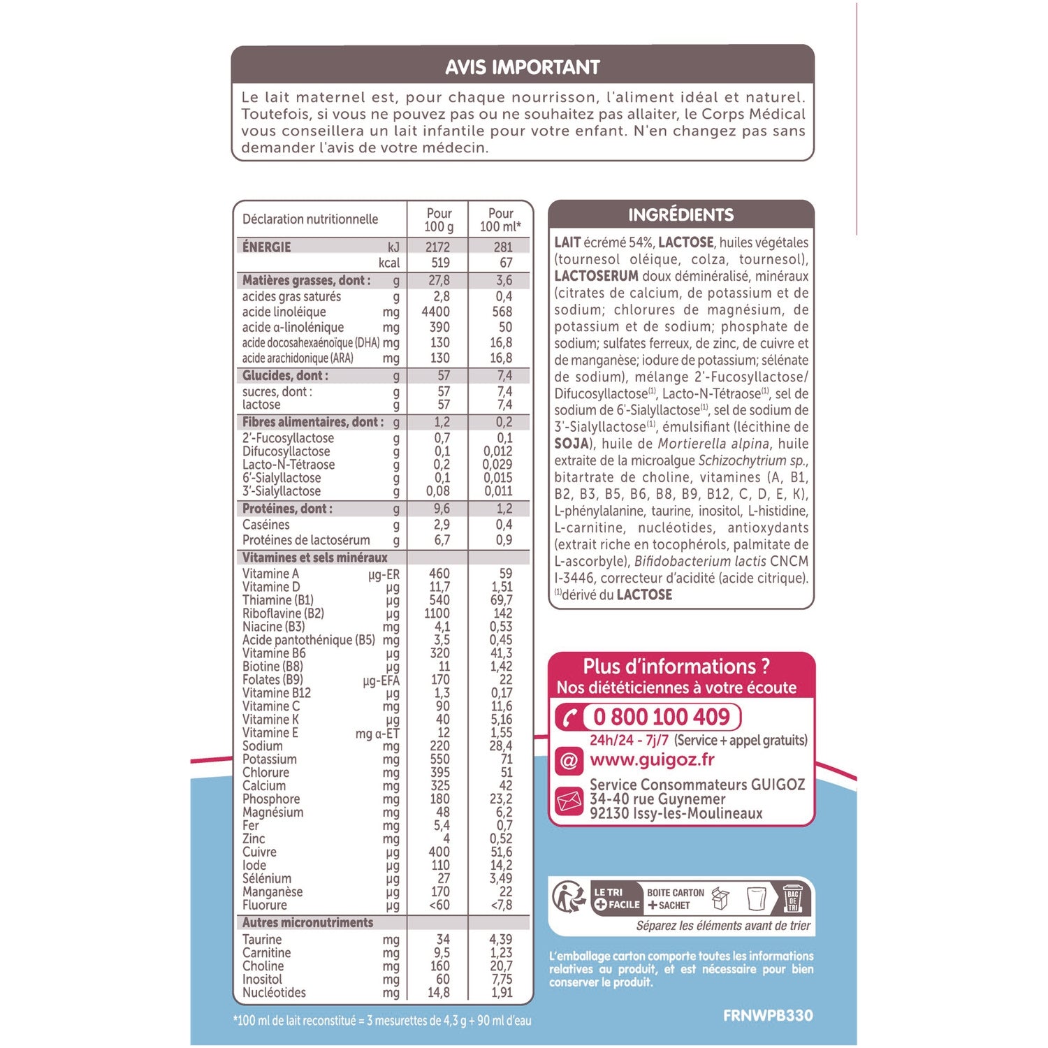 Ingredients: Skimmed MILK 54%, LACTOSE, vegetable oils (high oleic sunflower, rapeseed, sunflower), sweet demineralized WHEY, minerals (calcium, potassium and sodium citrates; magnesium, potassium and sodium chlorides; sodium phosphate; ferrous, zinc, copper and manganese sulfates; potassium iodide; sodium selenate), 2'-Fucosyllactose/Difucosyllactose¹ mixture, Lacto-N-Tetraose¹, 6'-Sialyllactose sodium salt¹, 3'-Sialyllactose sodium salt¹, emulsifier (SOY lecithin), Mortierella alpina oil, oil extracted from the microalgae Schizochytrium sp., choline bitartrate, vitamins (A, B1, B2, B3, B5, B6, B8, B9, B12, C, D, E, K), L-phenylalanine, taurine, inositol, L-histidine, L-carnitine, nucleotides, antioxidants (tocopherol-rich extract, L-ascorbyl palmitate), Bifidobacterium lactis CNCM I-3446, acidity regulator (citric acid). ¹derived from LACTOSE.