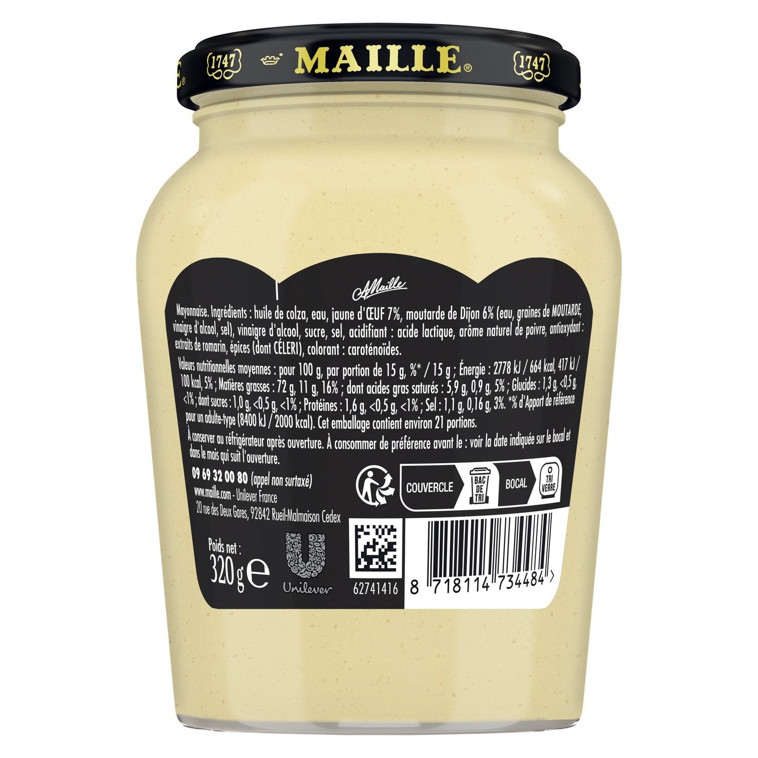 Fine Mayonnaise, Catering Quality, a refined Mayonnaise recipe, enhanced with the iconic Maille Dijon Mustard.,A natural mayonnaise with a perfectly balanced taste and a deliciously creamy texture.,Mayonnaise available in a 320g recyclable glass jar.,Fine Mayonnaise is the perfect accompaniment to a grated celery salad with a squeeze of lemon.,Ideal with shellfish, a spoonful of mayonnaise in a little crab meat for rillettes to die for.,Mayonnaises should be kept in the refrigerator after opening.