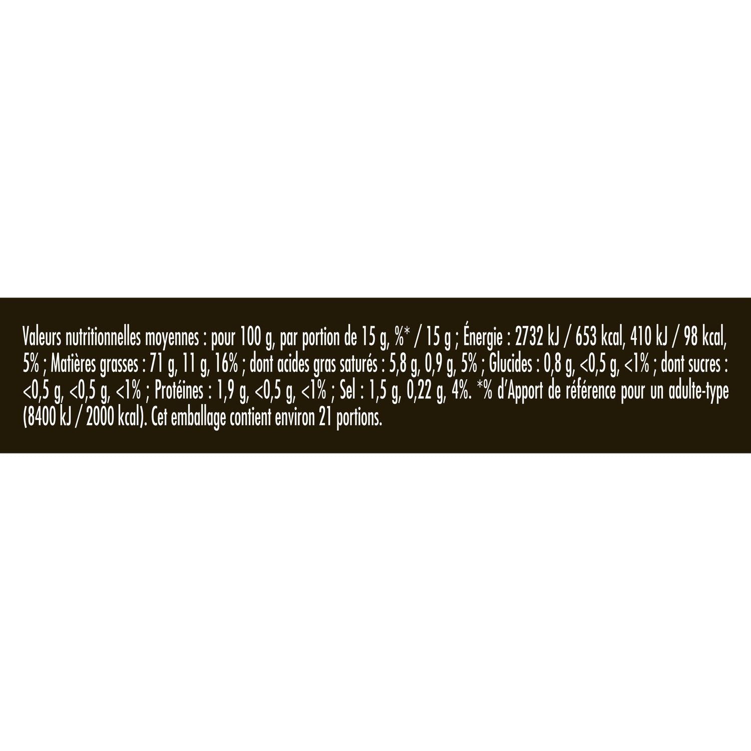 Energy value (kJ): 410 kJ / 15 g (5 %) | Energy value (kcal): 98 kcal / 15 g (5 %) | Fat: 11 g / 15 g (16 %) | Saturated fatty acids: 0.9 g / 15 g (5 %)