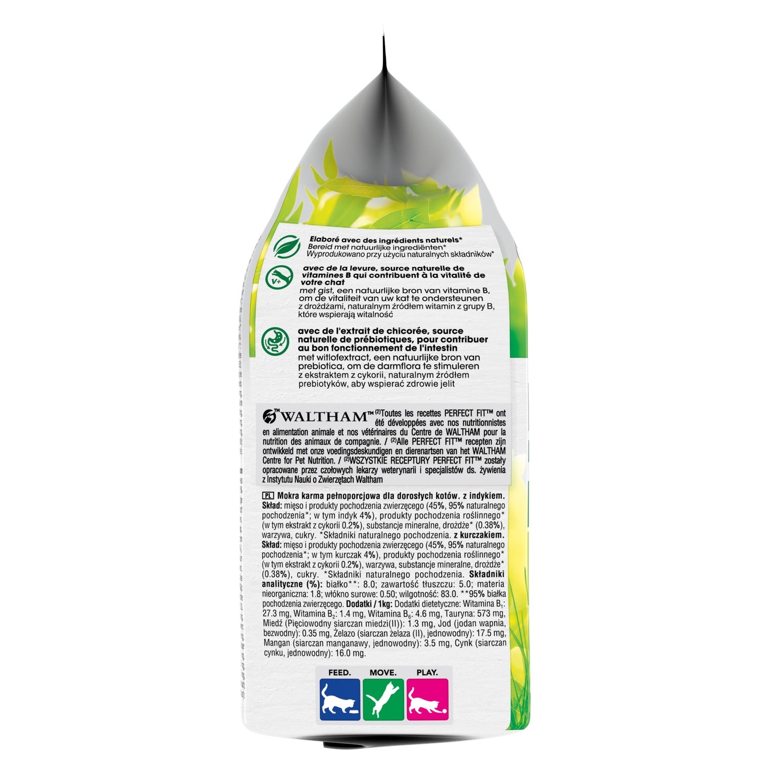Complete food for adult neutered cats - 2 varieties (turkey / chicken) with natural ingredients*. A cat food with 95% animal protein for guaranteed enjoyment! Perfect Fit™ Natural Vitality Adult 1+ Neutered Cat Fresh Pouches are made without grains, which can cause digestive discomfort in sensitive cats. They contain prebiotics to contribute to normal intestinal function and yeast, a natural source of B vitamins that contribute to your cat's vitality. A diet without added artificial preservatives All PERFECT FIT™ recipes have been developed with our animal nutritionists and veterinarians at the Waltham Centre for Companion Animal Nutrition, to ensure a cutting-edge, 100% complete and balanced diet.