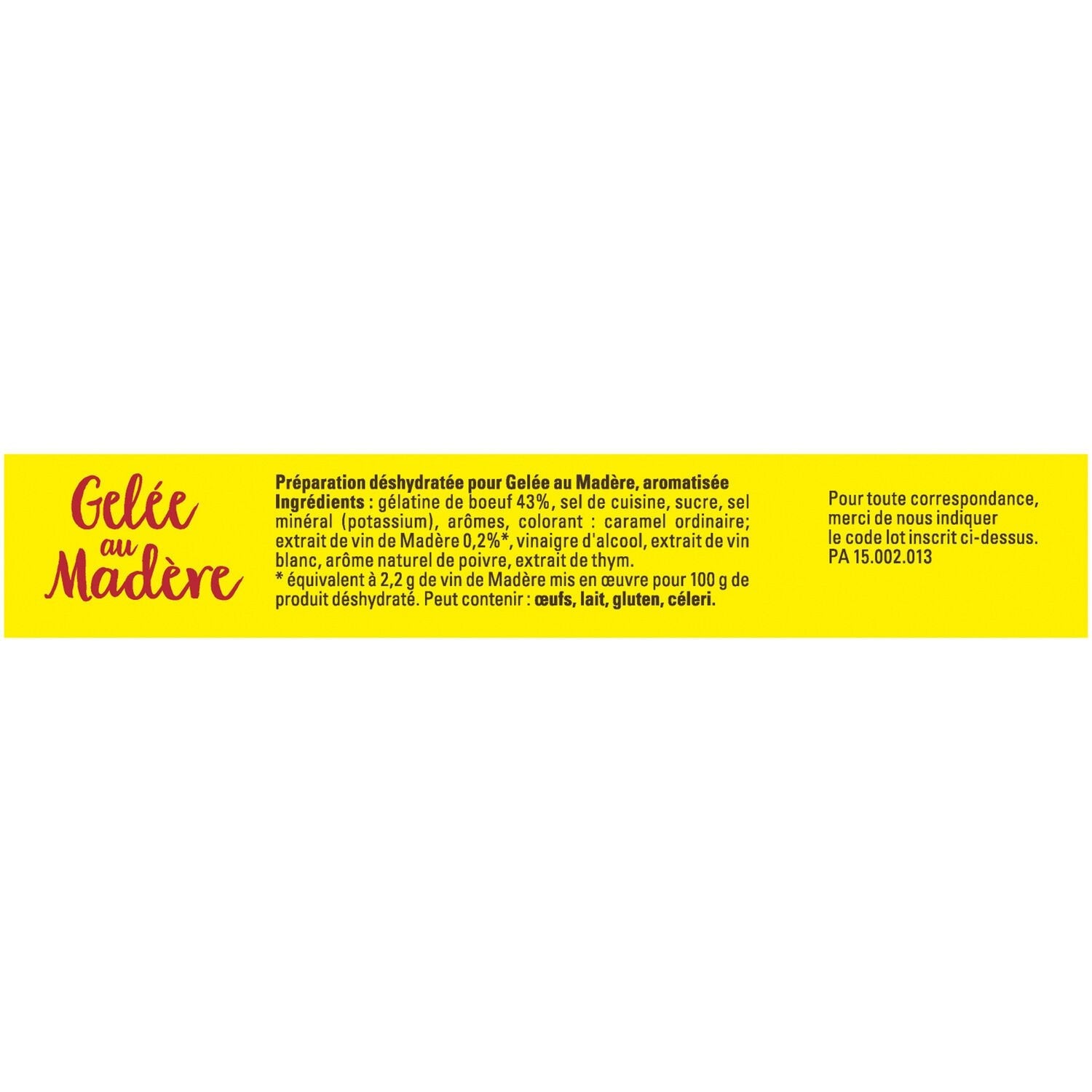 Ingredients: Beef gelatin 43%, cooking salt, sugar, mineral salt (potassium), flavorings, coloring: plain caramel; Madeira wine extract 0.2%*, spirit vinegar, white wine extract, natural pepper flavoring, thyme extract. *equivalent to 2.2 g of Madeira wine used per 100 g of dehydrated product. May contain: EGGS, MILK, GLUTEN, CELERY.