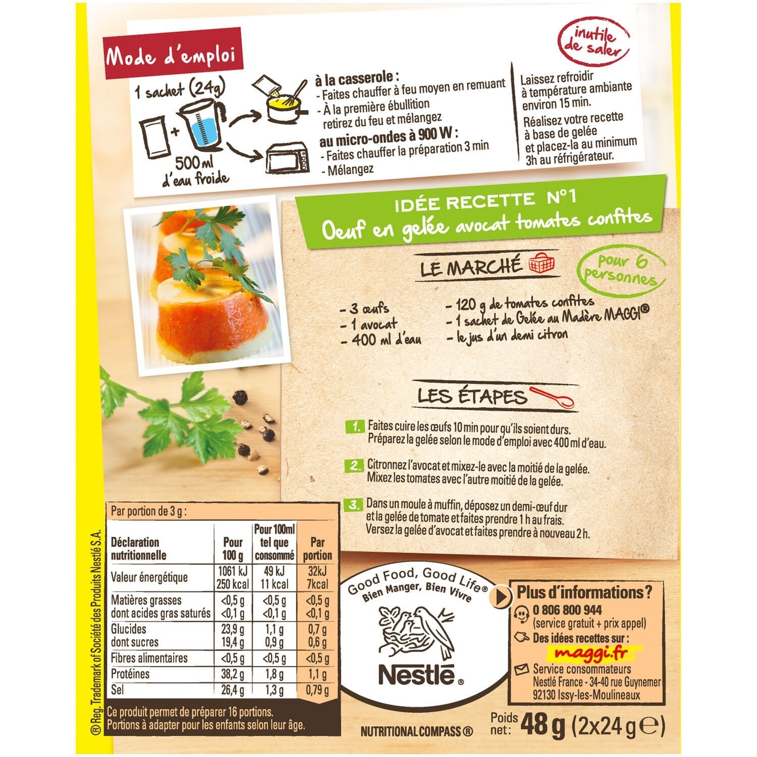 MAGGI Madeira Jelly is ideal for making fresh dishes subtly flavored with Madeira: terrines, eggs in jelly, festive meals. Easy to use jelly in a saucepan or microwave. MAGGI Madeira Jelly contains 2 sachets.