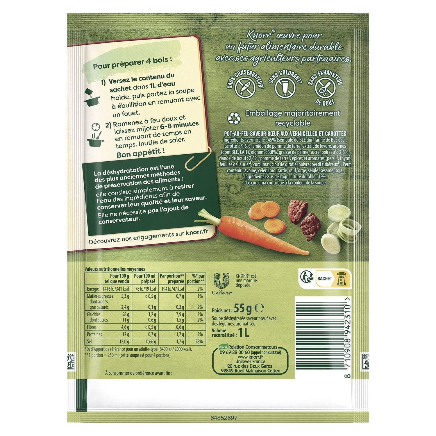 Discover the delicious Knorr® Dehydrated Beef Soup with Vermicelli, Nutri-score B.,Rediscover the taste of local recipes in these Knorr® dehydrated soups thanks to a blend of beautiful vegetables and quality ingredients.,A Nutri-score B dehydrated soup, without preservatives, colorings, or flavor enhancers.,Dehydration is one of the oldest methods of food preservation. To make this soup, the water has been removed from the ingredients to preserve their quality and flavor.,Contained in a recyclable bag, this format allows you to make 4 bowls of soup.,A comforting soup recipe ready in 6-8 minutes: pour the contents of the bag into 1 L of cold water then bring to a boil. Simmer for 6-8 min. It's ready!