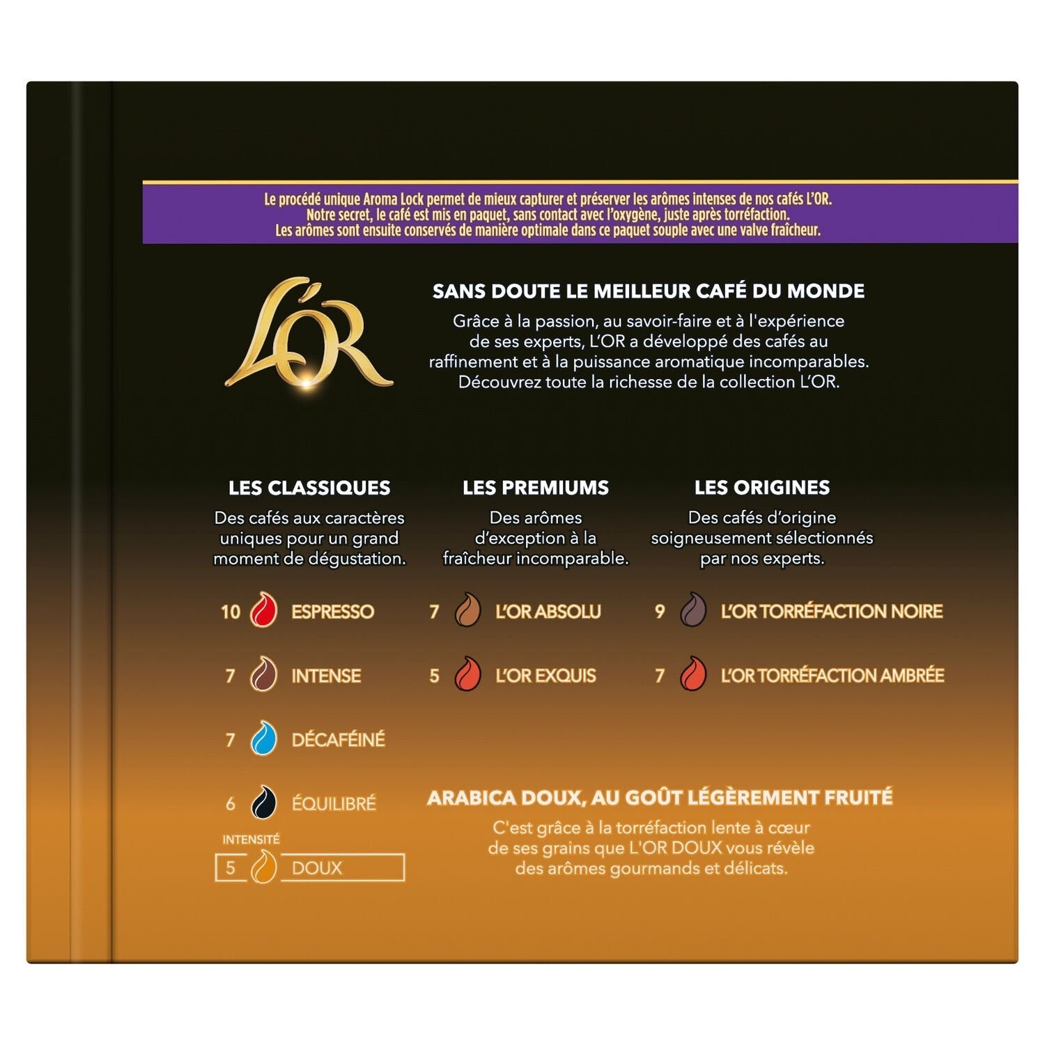 L'OR Doux est un café moulu 100% arabica, au goût légèrement fruité. C'est grâce à la torréfaction lente à cœur de ses grains que L'OR Doux vous révèle des arômes gourmands et délicats. Paquet de 500 grammes de café moulu. Niveau d'intensité 5