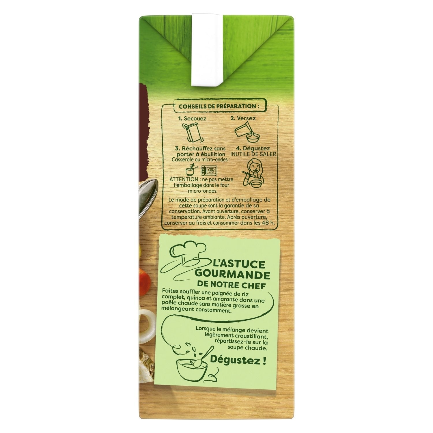 CONSEILS DE PRÉPARATION : 1. Secouez 2. Versez 3. Réchauffez sans porter à ébullition Casserole ou micro-ondes : 4. Dégustez INUTILE DE SALER