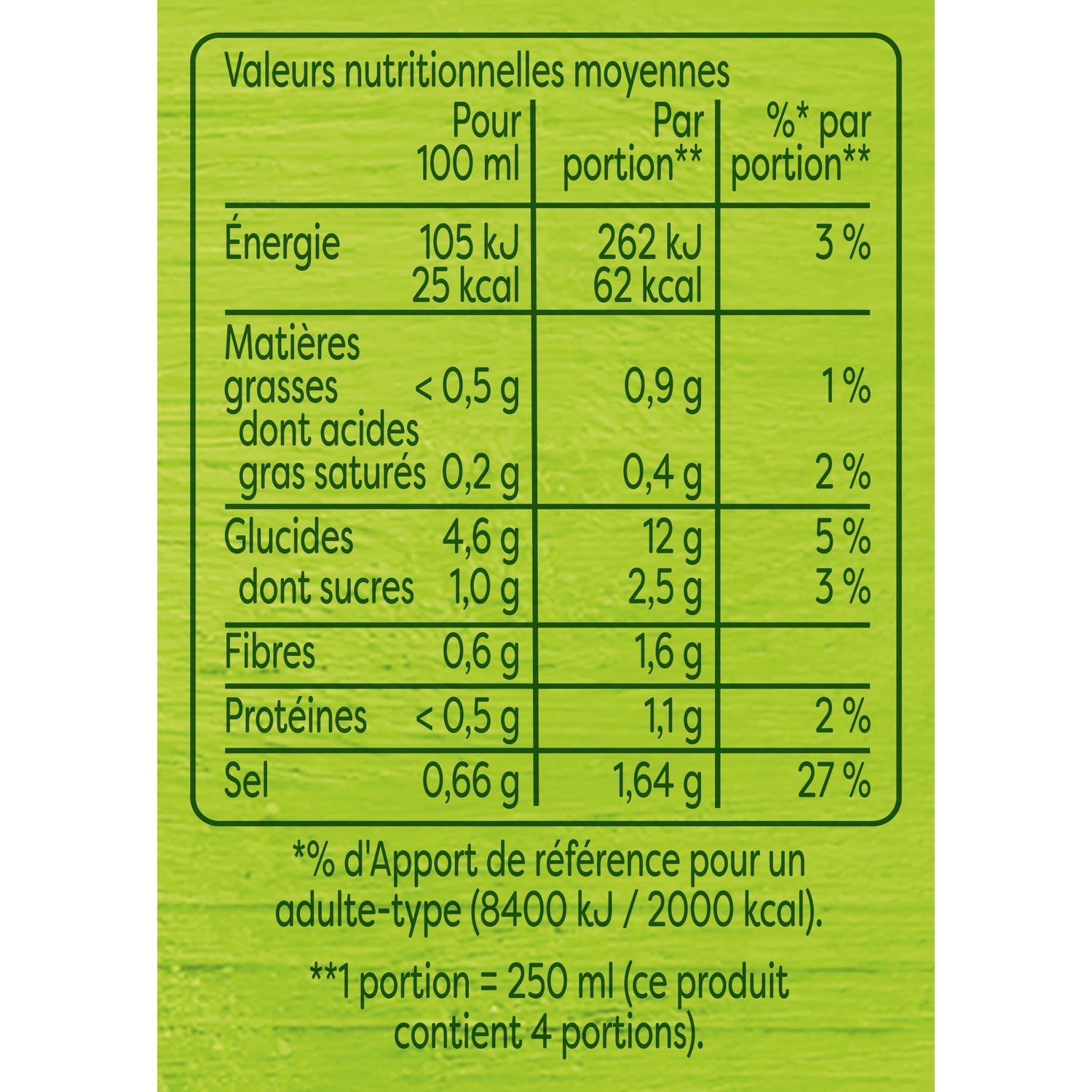 valeur énergétique (kcal) : 25 kcal / 100 mL