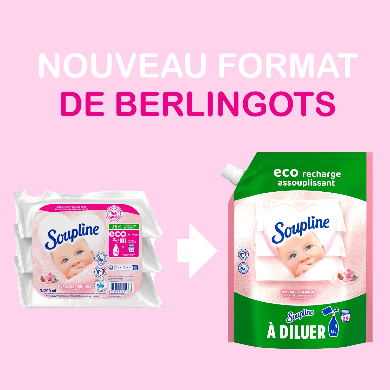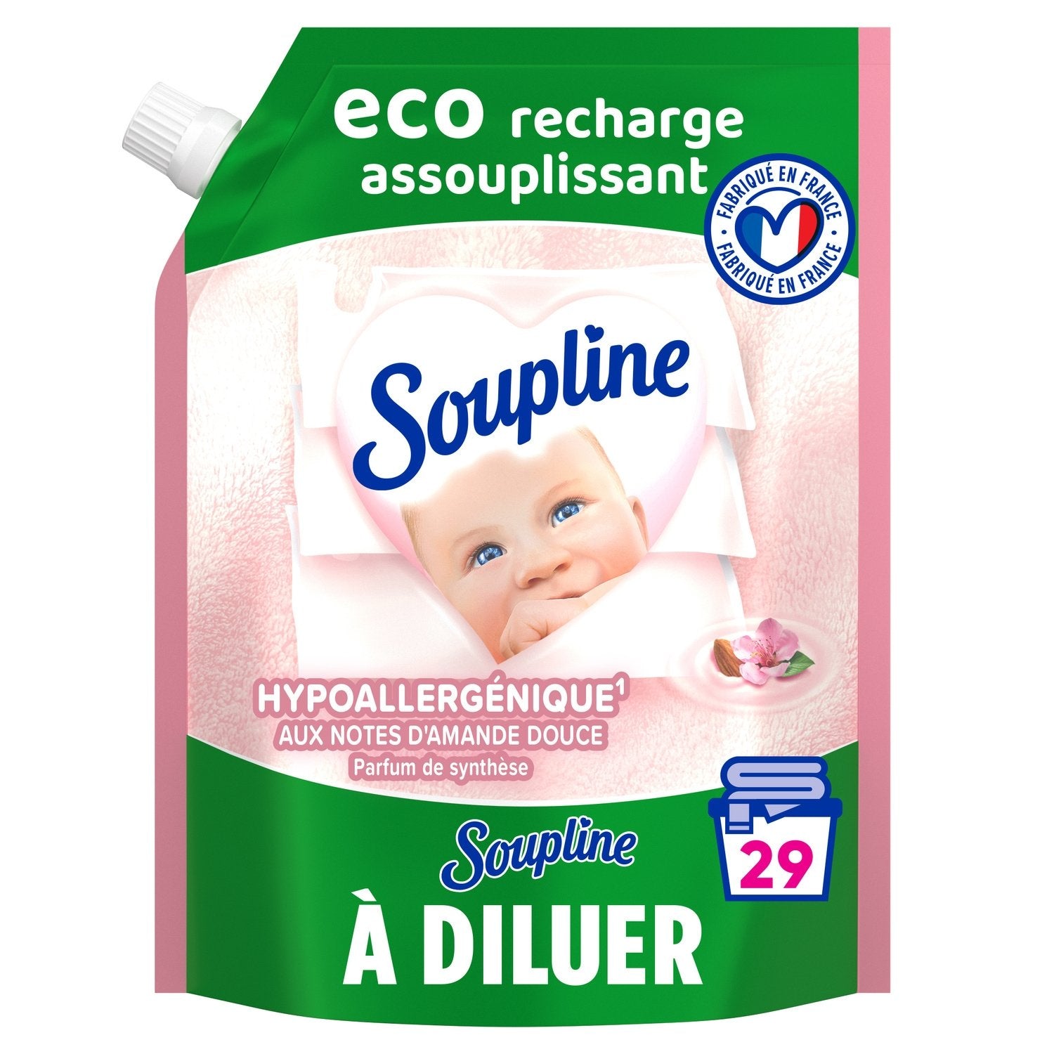 Découvrez les berlingots Soupline Hypoallergénique dans un nouveau format éco-recharge à diluer encore plus pratique et économique. Profitez de 30 Jours de fraîcheur garantie et d'une formule spécialement adaptée aux peaux sensibles ! Offrez à votre linge une douceur irrésistible grâce à sa formule au lait d'amande douce, testée dermatologiquement et sans colorant pour minimiser les risques d'allergie. Conditionnée dans un nouveau format doypack plus pratique, sa formule est active même à froid* et composée avec 92% d'ingrédients d'origine naturelle. *eau de lavage à 25°.