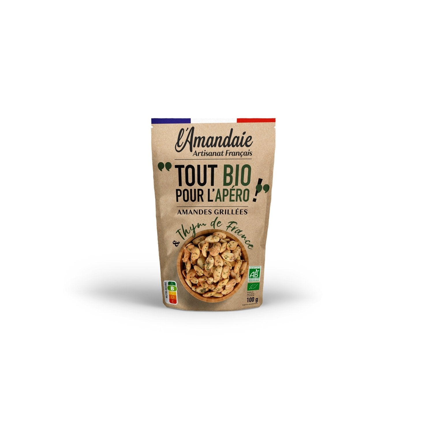 AMANDES* grillées 91% (UE), huile d'olive* vierge extra, fibres végétales (inuline d'agave*, acacia*), sirop d'agave*, sel marin de Camargue, thym* 0,6% (France).