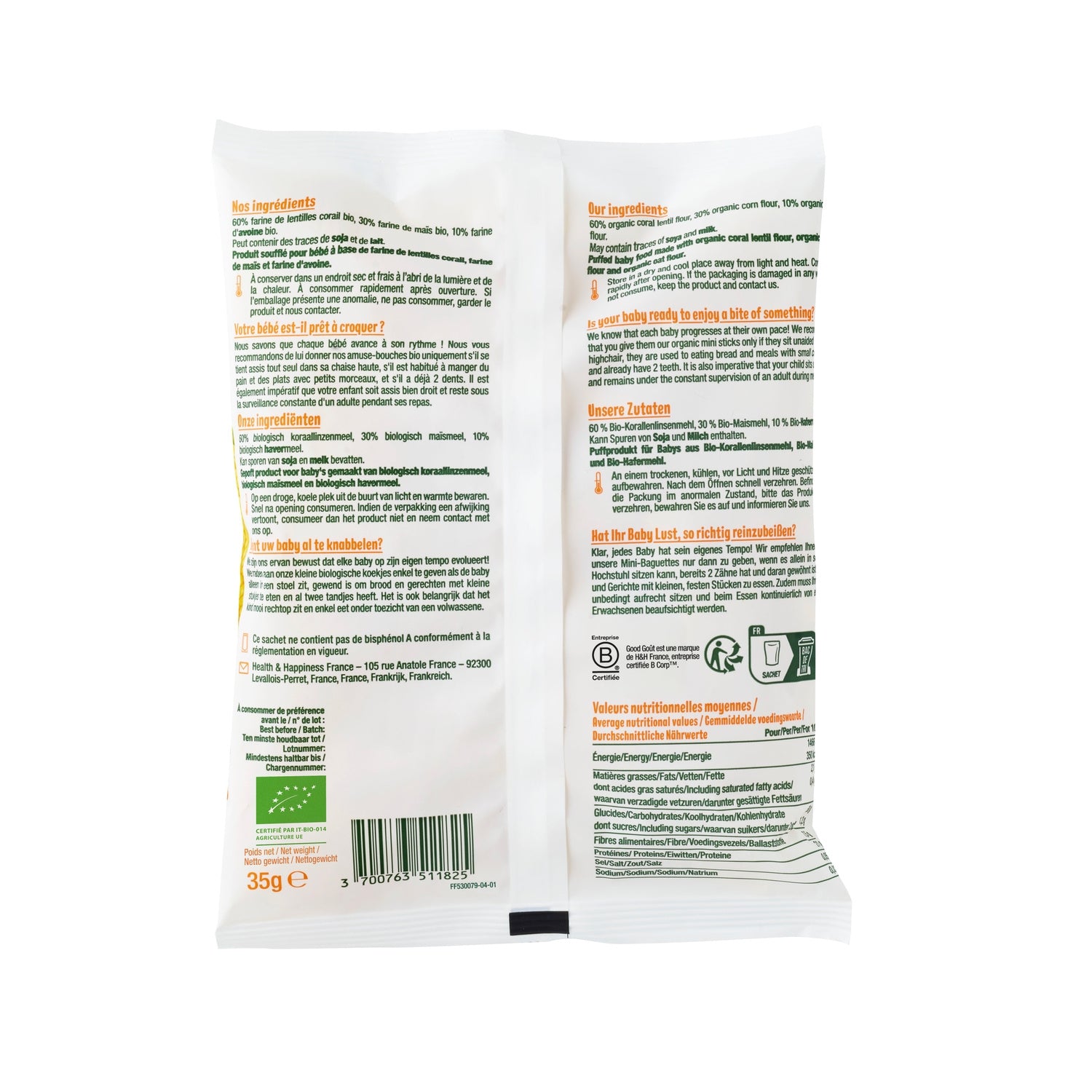Amuse-Bouches Bébé Dès 10 Mois Lentilles Corail Maïs et Avoine Bio les Amuse Bouches GOOD GOUT