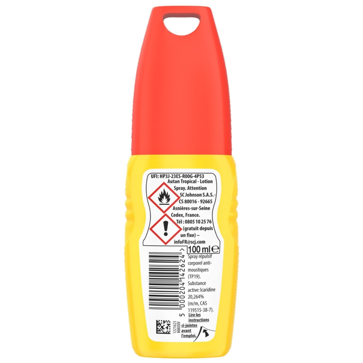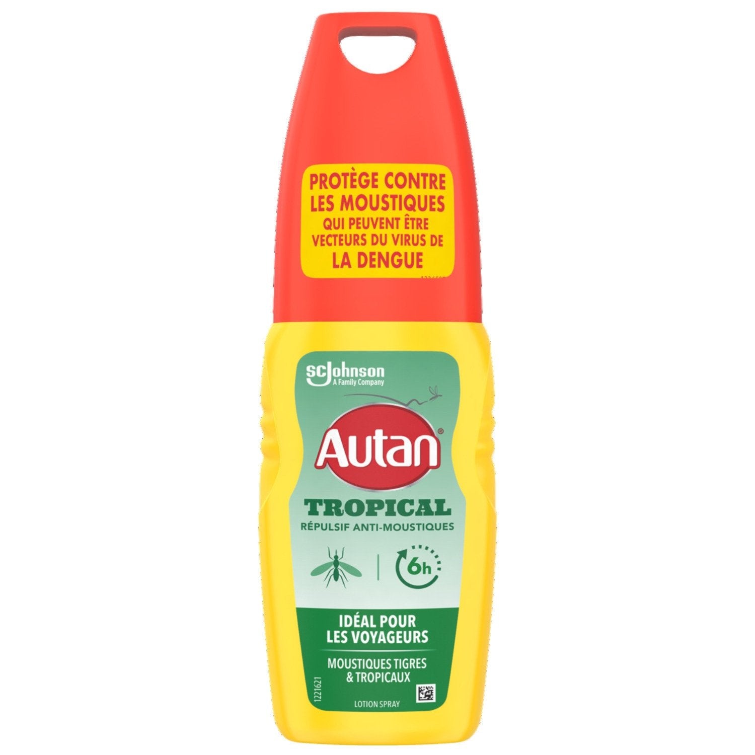 Autan® Tropical Spray vous protège contre les moustiques tigres et tropicaux.,Il vous offre jusqu'à 6 heures de protection contre les moustiques tigres et tropicaux.,Ce spray est idéal pour les activités en extérieur pendant les mois les plus chauds durant lesquels les moustiques émergent ou les séjours dans des pays tropicaux.,Il convient parfaitement aux enfants de plus de 2 ans.,Son format spray est pratique et facilite son application.,Autan® Tropical est testé dermatologiquement et a été accrédité par l'organisme Skin Health Alliance (une accréditation dermatologique indépendante qui certifie les produits).