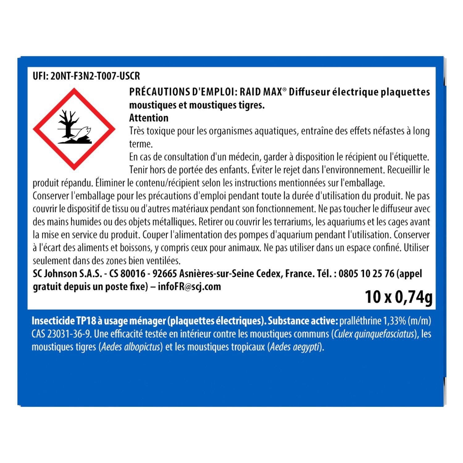 ACTION CONTINUE ET RAPIDE* : Chaque plaquette Raid Max® vous offre jusqu'à 12 heures de protection contre les moustiques communs et les moustiques tigres dans une pièce de 30m³. *Efficacité totale au bout de 30 minutes.,EFFICACITÉ MAXIMALE : fonctionne avec les lumières allumées. ,UTILISATION SIMPLE : Pour remplacer la plaquette usagée après 12 heures d'utilisation, débranchez le diffuseur puis faites glisser la nouvelle plaquette sous la grille de protection en poussant l'ancienne.,UNE BOÎTE CONTIENT : Un diffuseur électrique et 10 plaquettes de recharge.,Utilisez les produits insecticides avec précaution. Avant toute utilisation, lisez l'étiquette et les informations concernant le produit.