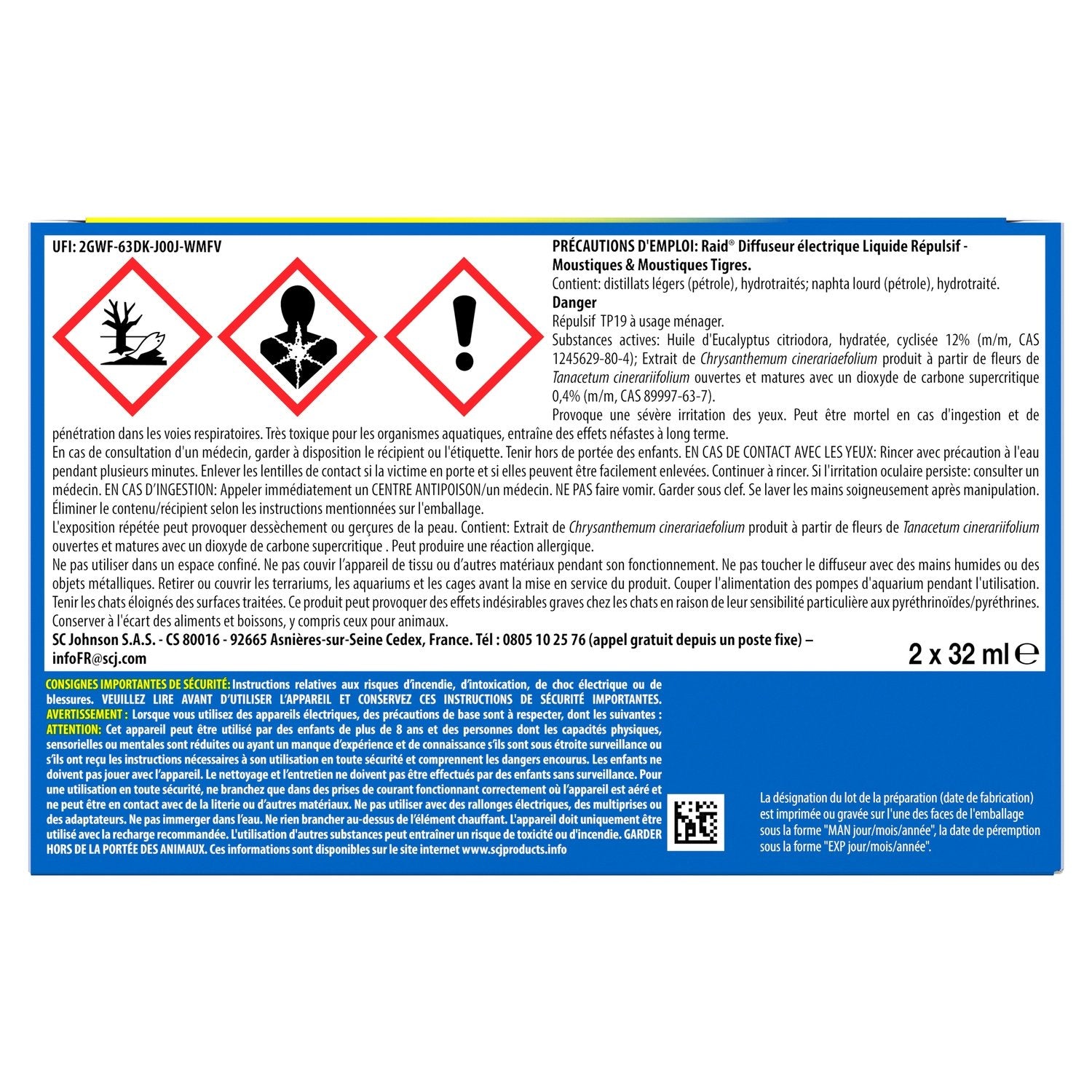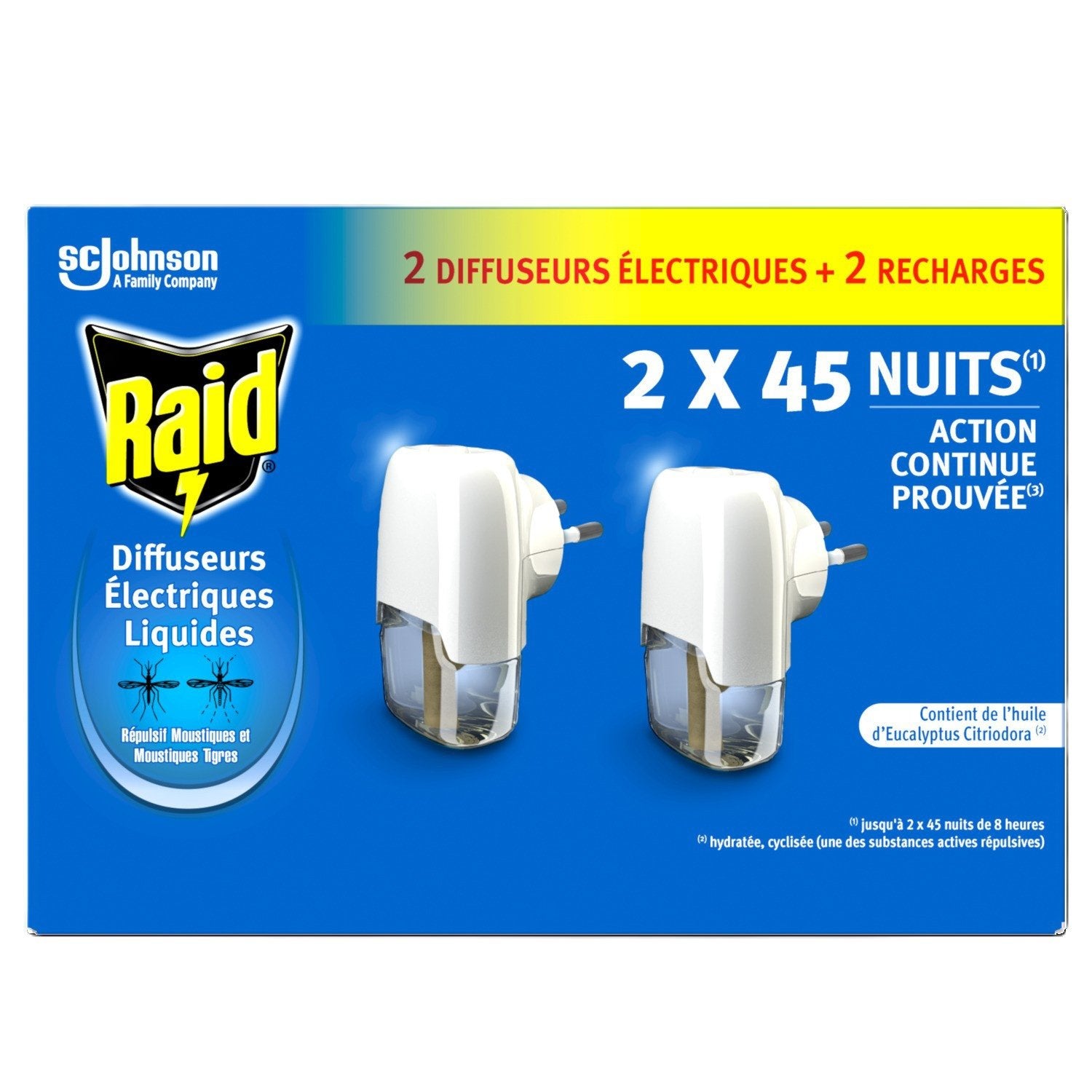 PROTECTION CONTINUE : Le diffuseur électrique liquide répulsif Raid® offre une protection contre les moustiques et les moustiques tigres.,NUITS SEREINES : Sa formule offre une action continue prouvée jusqu'à 45 nuits de 8 heures. Ne laissez plus les moustiques gâcher vos nuits ! ,Repoussez-les avec le diffuseur électrique liquide Raid®, la solution efficace pour des nuits sereines, sans la nuisance des moustiques !,FORMULE : Contient de l'huile d'Eucalyptus Citriodora, hydratée, cyclisée (une des substances actives répulsives). UNE BOÎTE CONTIENT : 2 diffuseurs électriques et 2 recharges de 45 nuits.,UTILISATION SIMPLE : Lorsque la recharge est vide, insérez une nouvelle recharge Raid en vissant le flacon-recharge dans le diffuseur jusqu'au bout. Utilisez les produits répulsifs avec précaution.,Avant toute utilisation, lisez l'étiquette et les informations concernant le produit. MAN date sur nos emballages signifie date de fabrication du lot et non date de péremption.