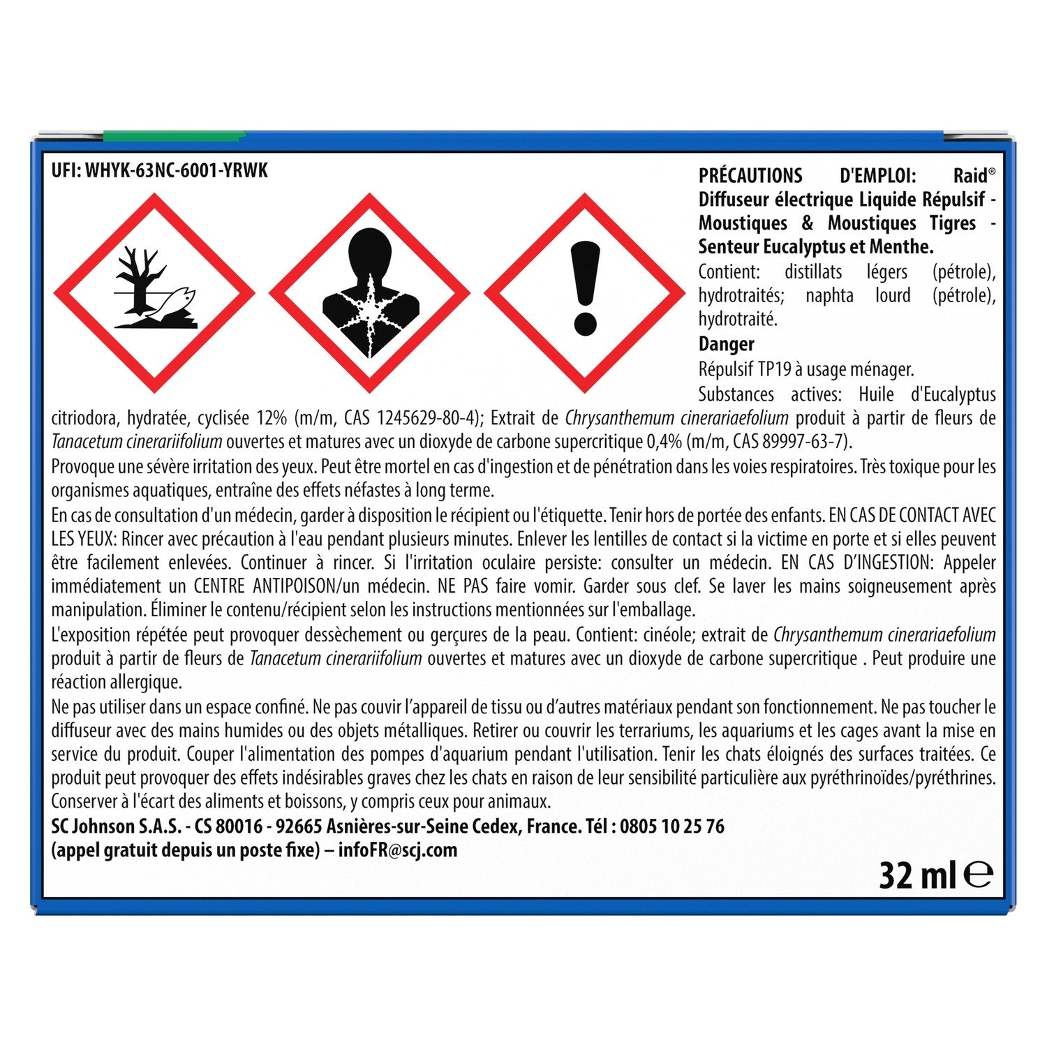 Ne laissez plus les moustiques gâcher vos nuits ! Repoussez-les avec le diffuseur électrique liquide Raid®, la solution efficace pour des nuits sereines, sans la nuisance des moustiques ! Le diffuseur électrique liquide répulsif senteur Eucalyptus et Menthe Raid® offre une protection contre les moustiques et les moustiques tigres. Sa formule offre une action continue prouvée* jusqu'à 45 nuits de 8 heures. *Efficacité testée en laboratoire sur l'inhibition d'atterrissage des moustiques et moustiques tigres (Culex et Aedes Albopictus). Utilisez les produits répulsifs avec précaution. Avant toute utilisation, lisez l'étiquette et les informations concernant le produit.