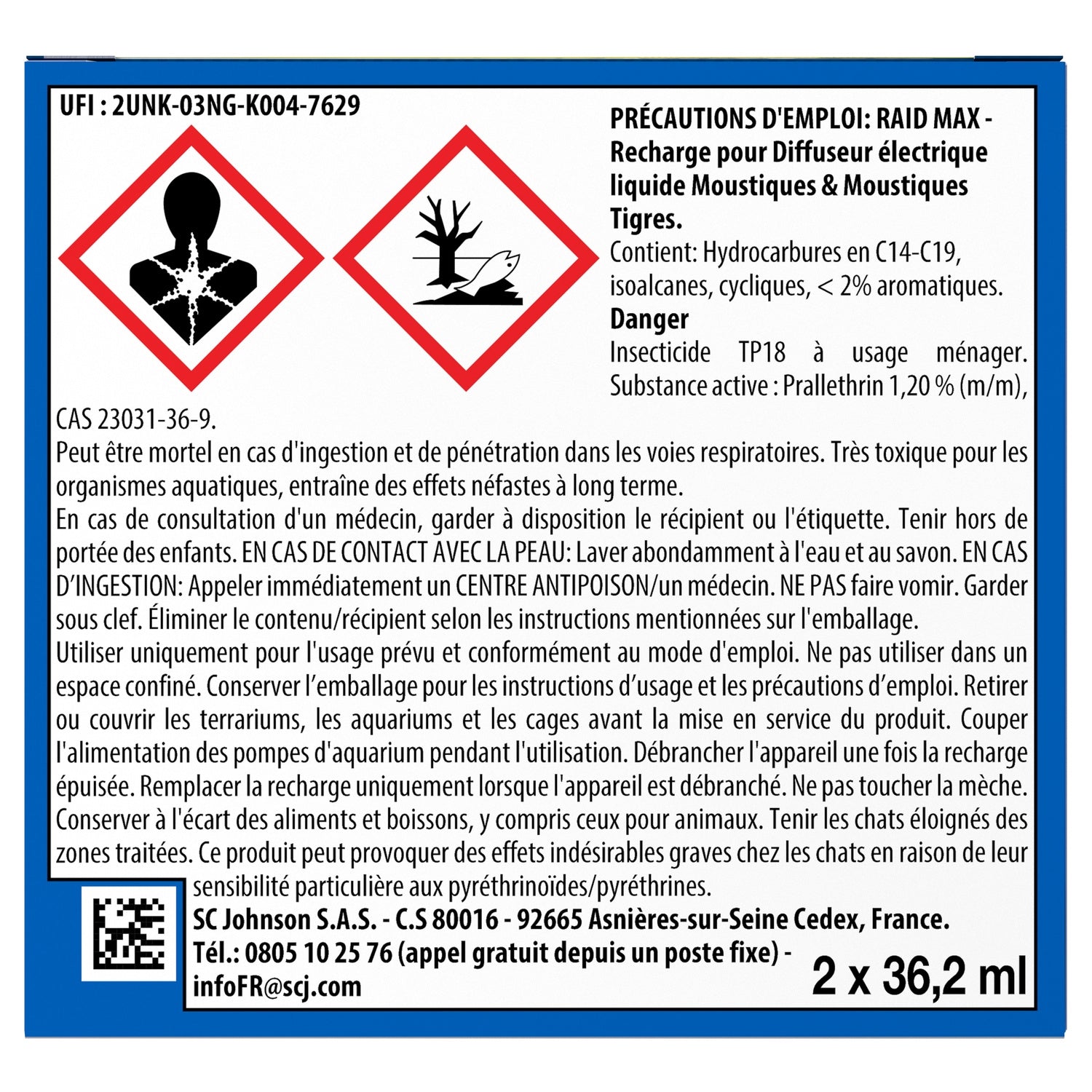 Raid MAX® recharges liquides pour diffuseur électrique anti-moustiques et moustiques tigres - 2x60 nuits – sans parfum ajouté – 2 recharges 2x36ml
