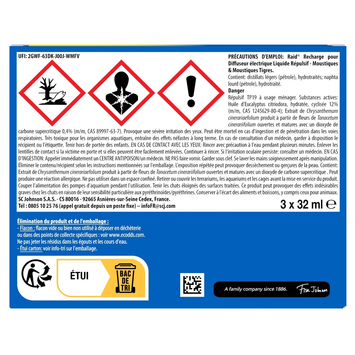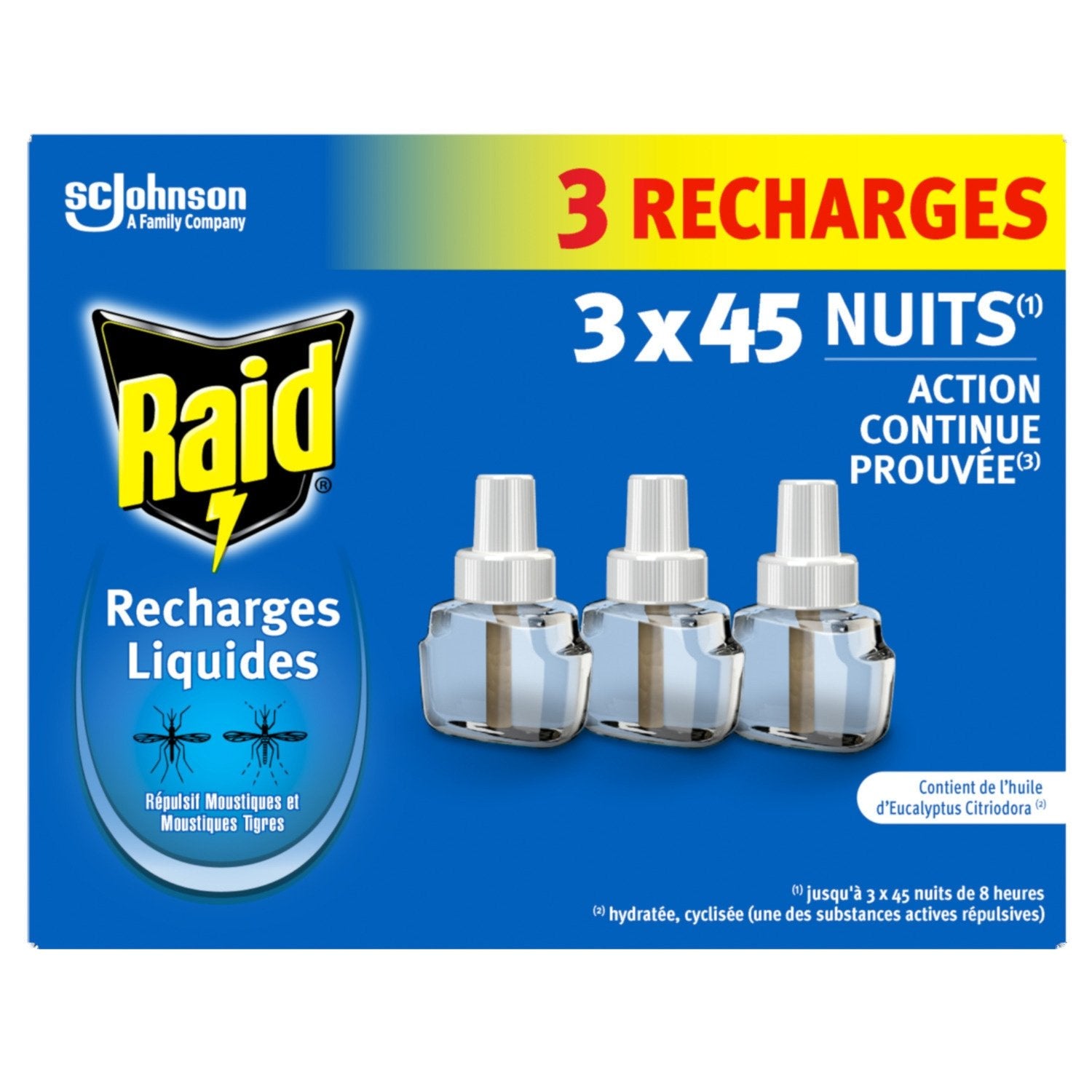 PROTECTION CONTINUE : Une recharge liquide répulsif Raid offre une protection contre les moustiques et les moustiques tigres.,NUITS SEREINES : Sa formule offre une action continue prouvée jusqu'à 45 nuits de 8 heures. Ne laissez plus les moustiques gâcher vos nuits ! ,Repoussez-les, avec le diffuseur éléctrique liquide Raid, la solution efficace pour des nuits sereines, sans la nuisance des moustiques !,FORMULE : Contient de l'huile d'Eucalyptus Citriodora, hydratée, cyclisée (une des substances actives répulsives). UNE BOÎTE CONTIENT : 3 recharges de 45 nuits.,UTILISATION SIMPLE : Lorsque la recharge est vide, insérez une nouvelle recharge Raid en vissant le flacon-recharge dans le diffuseur jusqu'au bout. Utilisez les produits répulsifs avec précaution. ,Avant toute utilisation, lisez l'étiquette et les informations concernant le produit. MAN date sur nos emballages signifie date de fabrication du lot et non date de péremption.