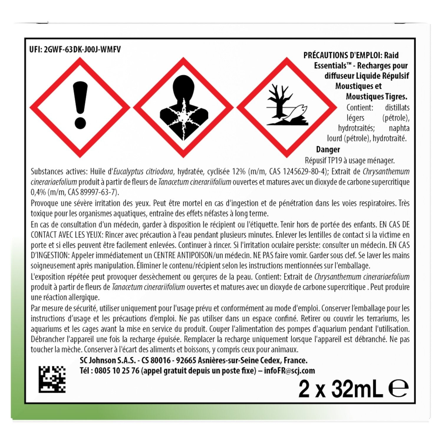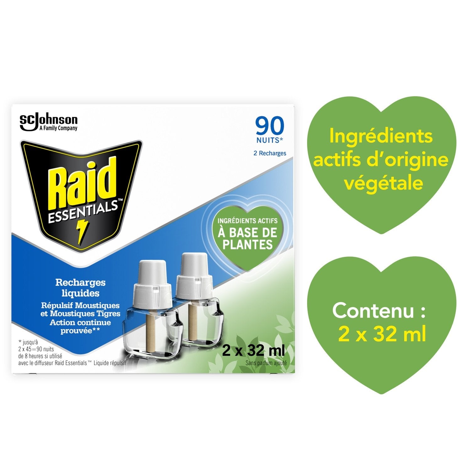 Ne laissez plus les moustiques gâcher vos nuits ! Repoussez-les avec la recharge liquide Raid Essentials®, la protection contre les moustiques pour toute la famille*! Sa formule avec une substance active à base de plantes** vous protèges contre les moustiques et les moustiques tigres*** jusqu'à 45 nuits de 8 heures. *Peut être utilisé dans les chambres d'enfants de 6 mois et plus, basé sur 8 heures d'utilisation par nuit. **Dérivés de fleurs de chrysanthème et de feuilles d'eucalyptus représentant 12,4% des ingrédients de la formule, les 87,6% restants étant synthétiques. ***Efficacité testée en laboratoire sur l'inhibition d'atterrissage des Moustiques et Moustiques Tigres (Culex et Aedes Albopictus). Utilisez les produits répulsifs avec précaution. Avant toute utilisation, lisez l'étiquette et les informations concernant le produit.