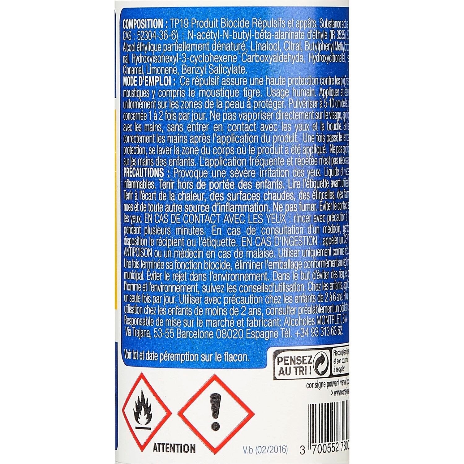 TP19 produit biocide répulsifs et appâts. Substance active (n° CAS : 52304-36-6) : n-acétyl-n-butyl-bêta-alaninate d'éthyle (IR 3535) 20%. Alcool éthylique partiellement dénaturé, linalool, citral, butylphenyl methylpropional, hydroxyisohexyl-3-cyclohexene carboxaldehyde, hydroxycitronellal, hexyl cinnamal, limonene, benzyl salicylate.