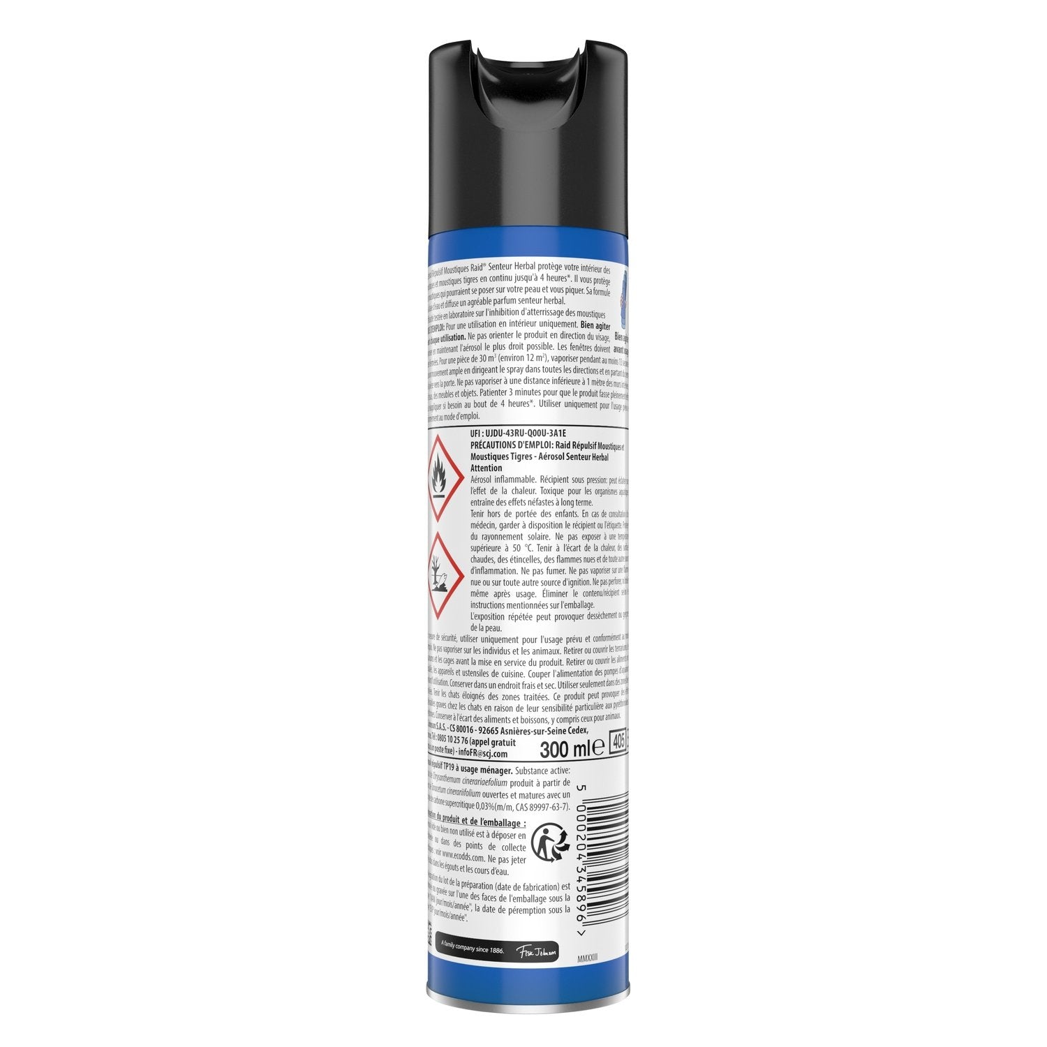 Mode d'emploi: Pour une utilisation en intérieur uniquement. Bien agiter avant chaque utilisation. Ne pas orienter le produit en direction du visage, vaporiser en maintenant l'aérosol le plus droit possible. Les fenêtres doivent rester fermées. Pour une pièce de 30m3 (environ 12m2), vaporiser pendant au moins 13 secondes dans un mouvement ample en dirigean le spray dans toutes les directions et en partant du centre de la pièce vers la porte. Ne pas vaporiser à une disance inférieure à 1 mètre des murs intérieurs, des tissus, des meubles et objets. Patienter 15 minutes pour que le produit fasse pleinement effet, puis réappliquer si besoin au bout de 4 heures*. Utiliser uniquement pour l'usge prévu et conformément au monde d'emploi. *efficacité testée en laboratoire sur l'inhibition d'atterrissage des Moustiques (Culex)