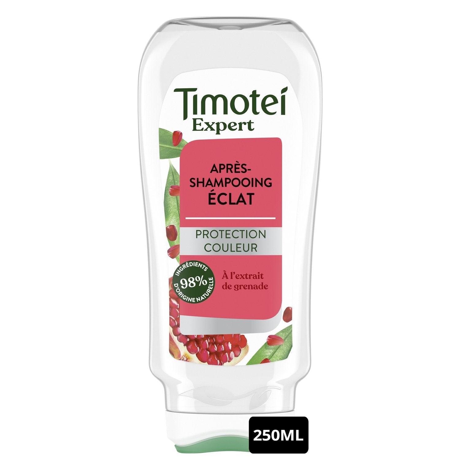 Découvrez l'après-shampooing Timotei Eclat Protection Couleur à la kératine végétale et extrait de grenade pour cheveux colorés ou méchés.,Cet après-shampooing enrichi avec la technologie ColourShield démêle facilement vos cheveux et prolonge l'intensité et la brillance de votre couleur jusqu'à 8 semaines.,La formule testée dermatologiquement de l'après-shampooing Timotei Eclat Protection Couleur contient 98 % d'ingrédients d'origine naturelle.,Un après-shampooing sans silicone pour un volume naturel.,Contient des agents démêlants d'origine végétale, pour un soin cheveux tout en douceur, puisé de la nature et enrichi en complexe d'huile de coco.,Nos bouteilles sont fabriquées avec 100 % de plastique recyclé* et sont transparentes pour faciliter leur recyclage. *Hors bouchon et étiquettes.