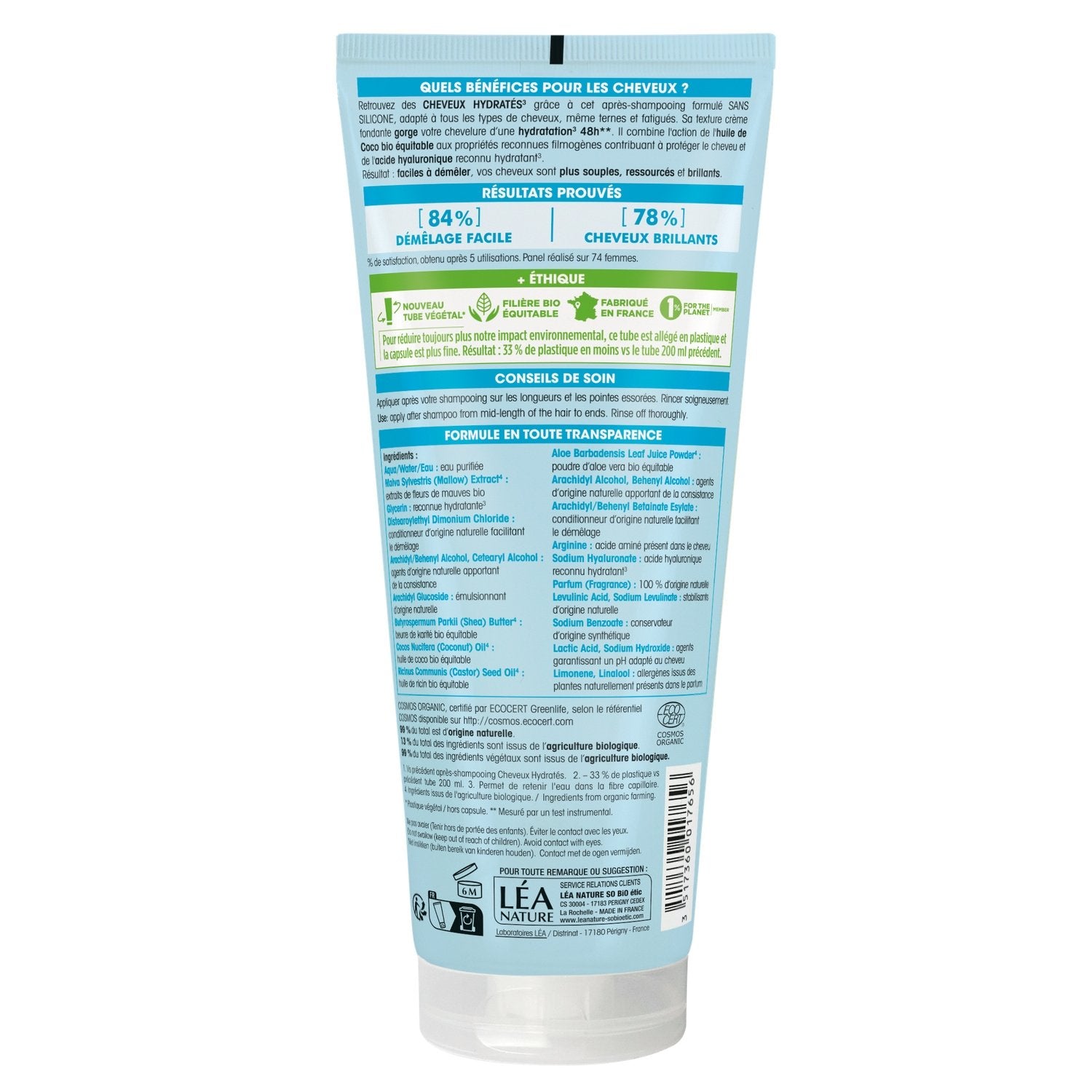 L'après-shampooing Cheveux Hydratés SO BiO étic, adapté à tous les types de cheveux, combine l'action de l'huile de Coco bio équitable aux propriétés reconnues filmogènes contribuant à protéger le cheveu et de l'acide hyaluronique reconnu hydratant. Formulé sans silicone et sans huile minérale afin de respecter vos cheveux. Résultats : Faciles à démêler, vos cheveux sont plus souples, doux et brillants ! '-Démêlage facile : 84% -Cheveux brillants : 78% % de satisfaction, obtenu après 5 utilisations. Panel réalisé sur 74 femmes. COSMOS ORGANIC certifié par ECOCERT Greenlife 99% d'origine naturelle 0% silicone, huile minérale +ETHIQUE : - Filière bio équitable - Nouveau tube végétal (hors capsule) : 33 % de plastique en moins vs le tube 200 ml précédent. - Fabriqué en France - 1% for the planet