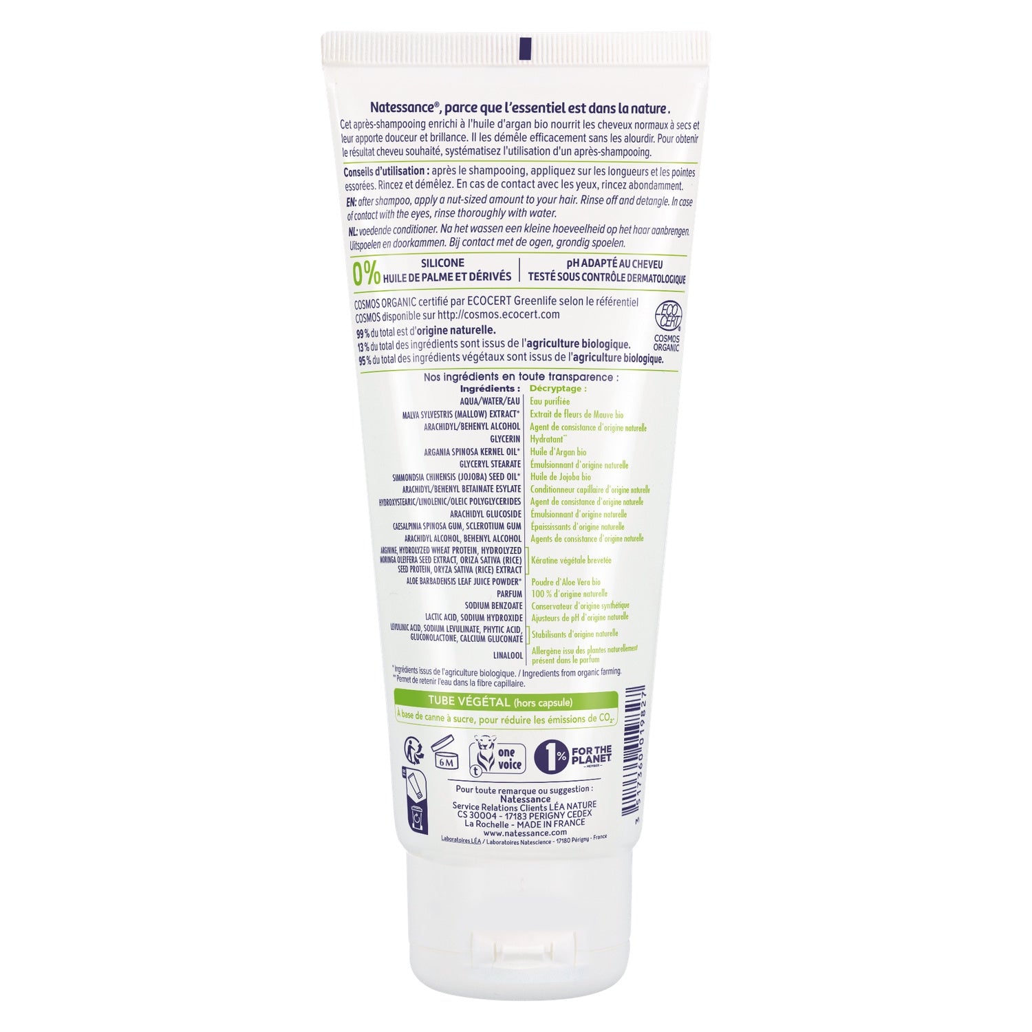 Découvrez la gamme capillaire Natessance, alliant naturalité, grâce à des ingrédients soigneusement sélectionnés, et sensorialité des textures et des parfums. L'après-shampooing nourrissant Natessance à l'huile d'argan bio est destiné aux cheveux normaux à secs, pour leur apporte douceur et brillance. Formulé sans silicone et sans huile de palme pour respecter la nature de vos cheveux. Résultats : Vos cheveux retrouvent nutrition et douceur ! Natessance®, parce que l'essentiel est dans la nature.
