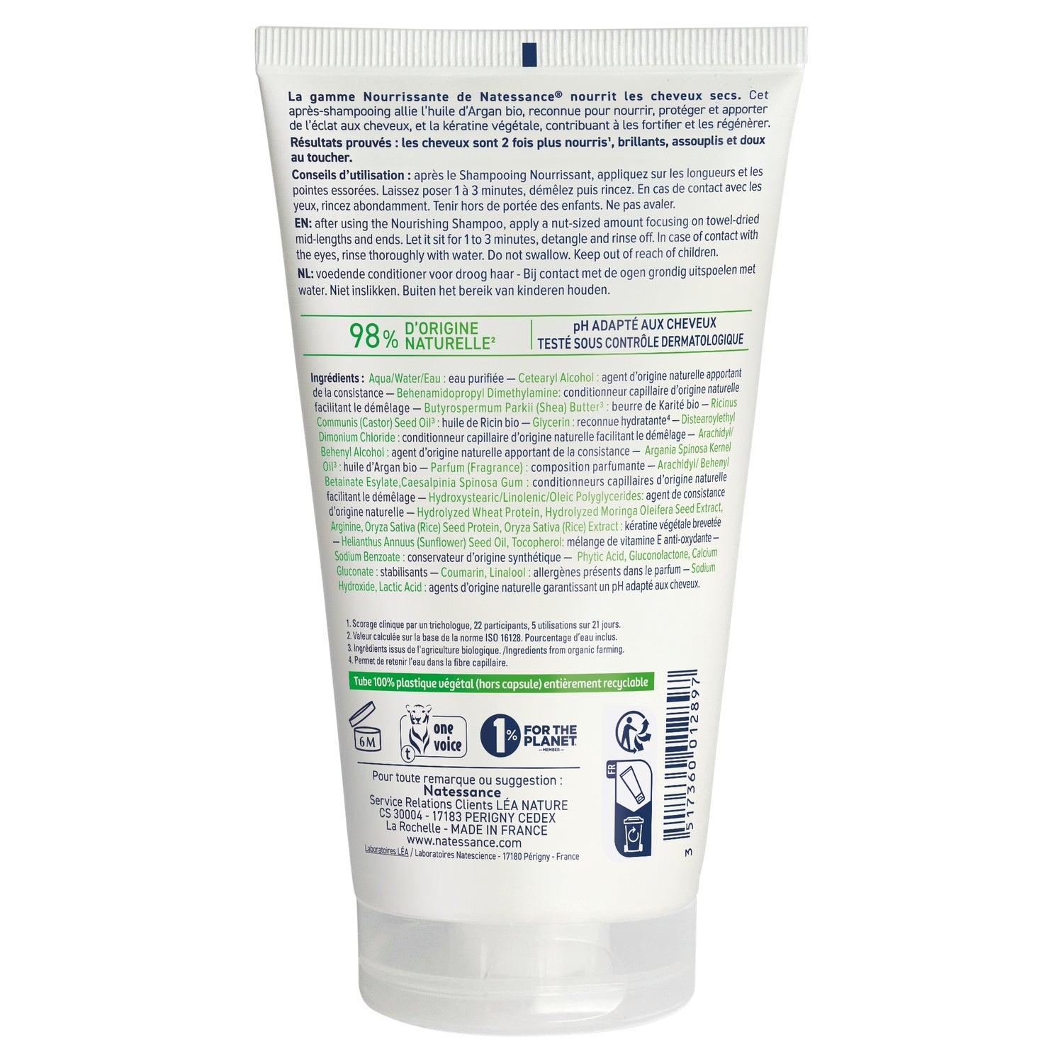 A partir de 30 ans, les cheveux s'affaiblissent, deviennent plus fragiles et sont en perte de matière. Le cuir chevelu devient sec et inconfortable.La gamme capillaire Argan Natessance® rétablit le mode de fonctionnement d'un cuir chevelu plus jeune pour retrouver une chevelure plus dense et éclatante de beauté.Elle associe deux actifs phares : l'huile d'argan qui apporte souplesse, force et brillance, et la kératine végétale qui régénère le cheveu en profondeur et le protège.L'après-shampooing Nutrition intense à l'argan Natessance a été testé et adoré par les testeuses deHYPERLINK 'https://www.beaute-test.com/' Beauté Test !Sans sulfates* - sans siliconeTESTÉ SOUS CONTRÔLE DERMATOLOGIQUE