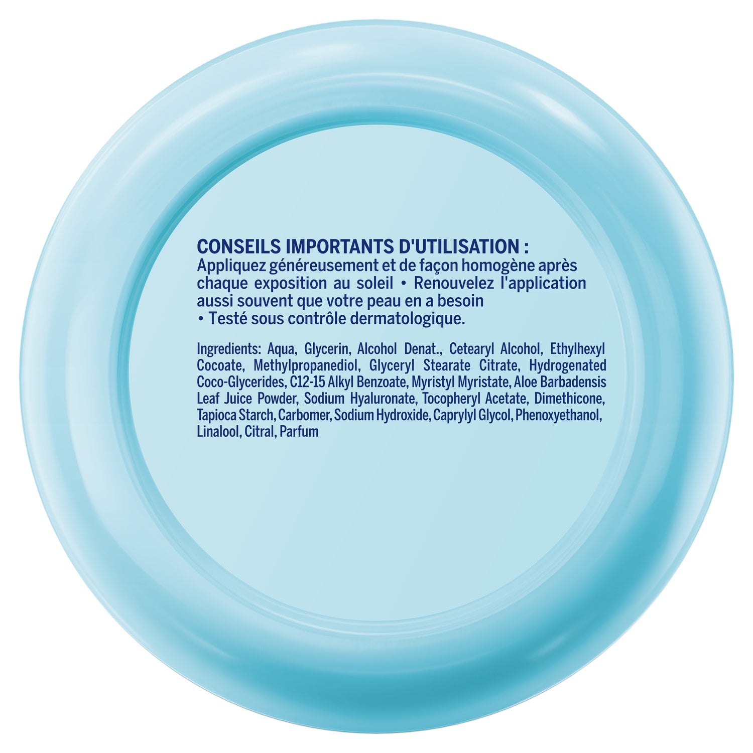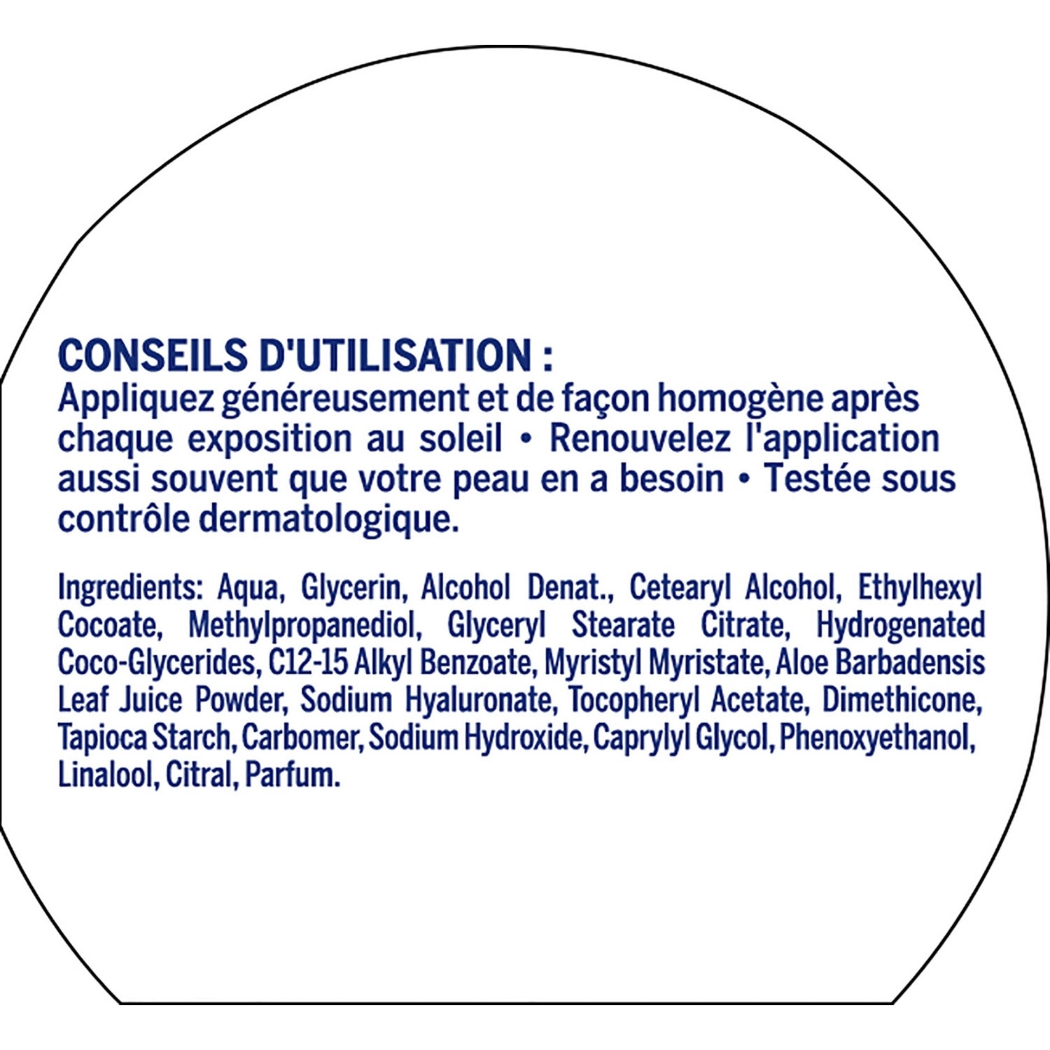 Appliquez généreusement et de façon homogène après l'exposition au soleil. Laissez pénétrer le lait et renouvelez l'application aussi souvent que nécessaire. Evitez le contact avec les yeux. Testé sous contrôle dermatologique.