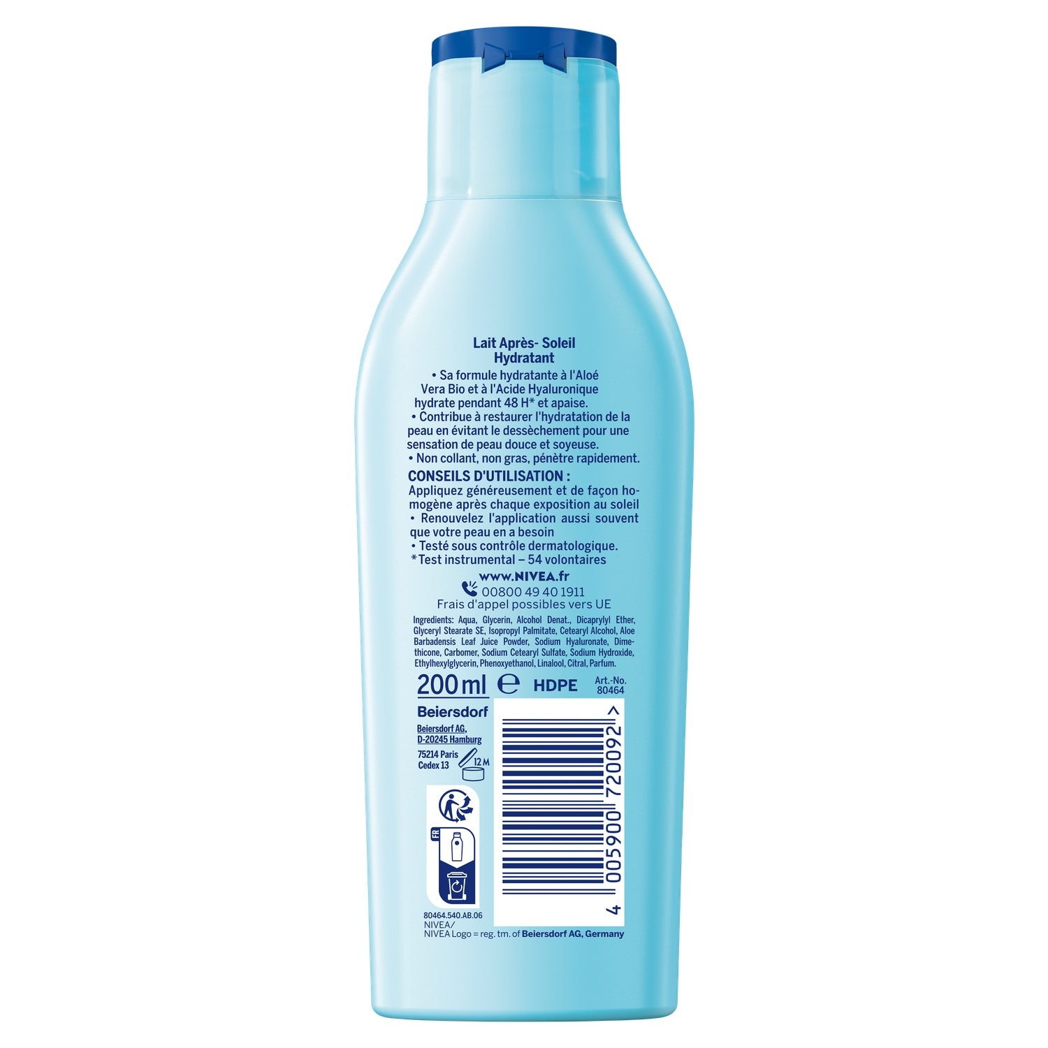 Le Lait Après-soleil hydratant à l'Aloe Vera et à l'Acide Hyaluronique NIVEA SUN procure une sensation de peau douce après l'exposition au soleil. Sa formule enrichie à l'Aloé Vera Bio, à la Vitamine E et à l'Acide Hyaluronique hydrate intensément pendant 48 heures (Test instrumental – 26 volontaires) et apaise la peau pour un confort durable. Tolérance cutanée testée sous contrôle dermatologique.