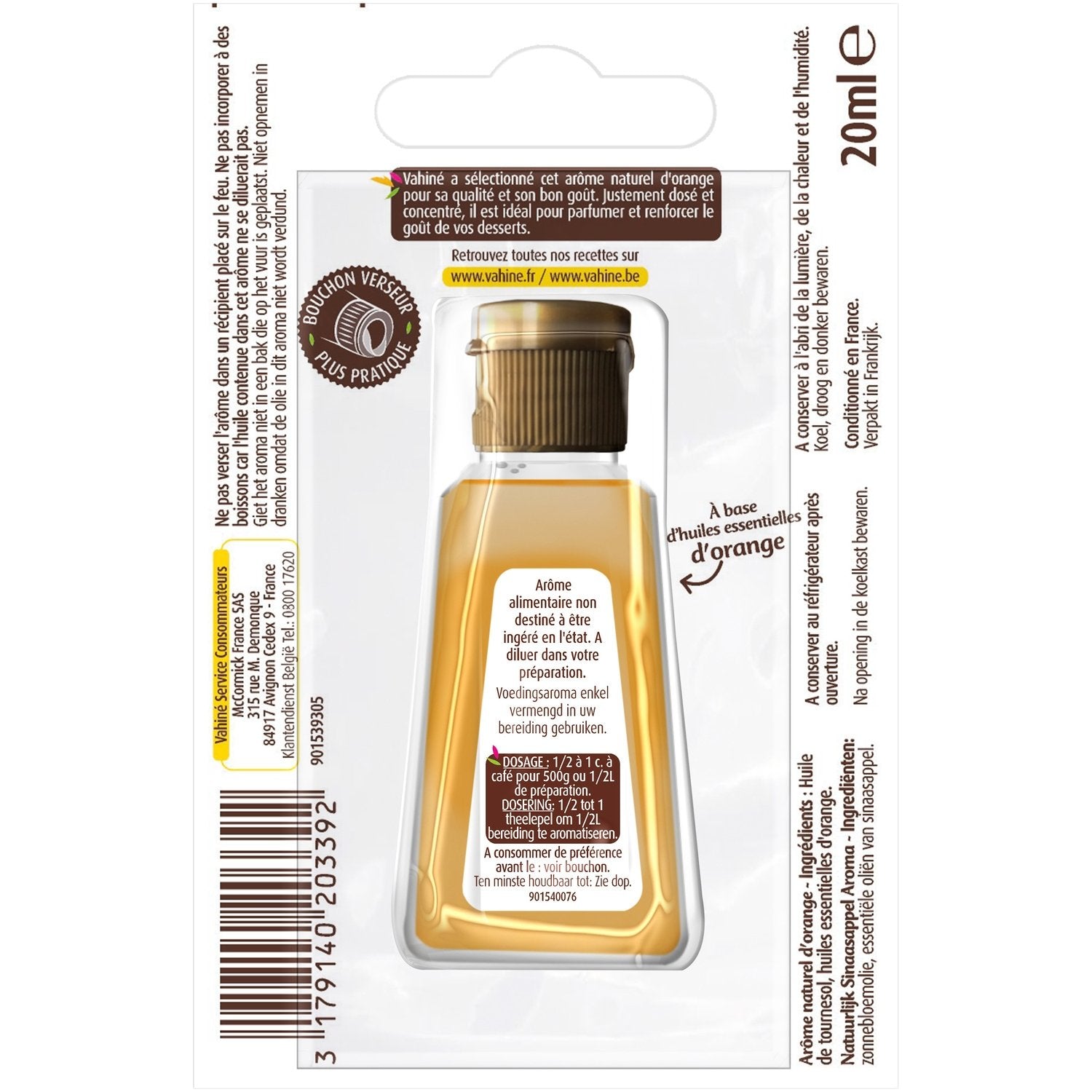 Un arôme naturel d'orange pratique avec son bouchon verseur, conditionné en France.,Arôme Naturel. CONDITIONNÉEN FRANCE. BOUCHON VERSEURPLUS PRATIQUE. À based'huiles essentiellesd'orange.