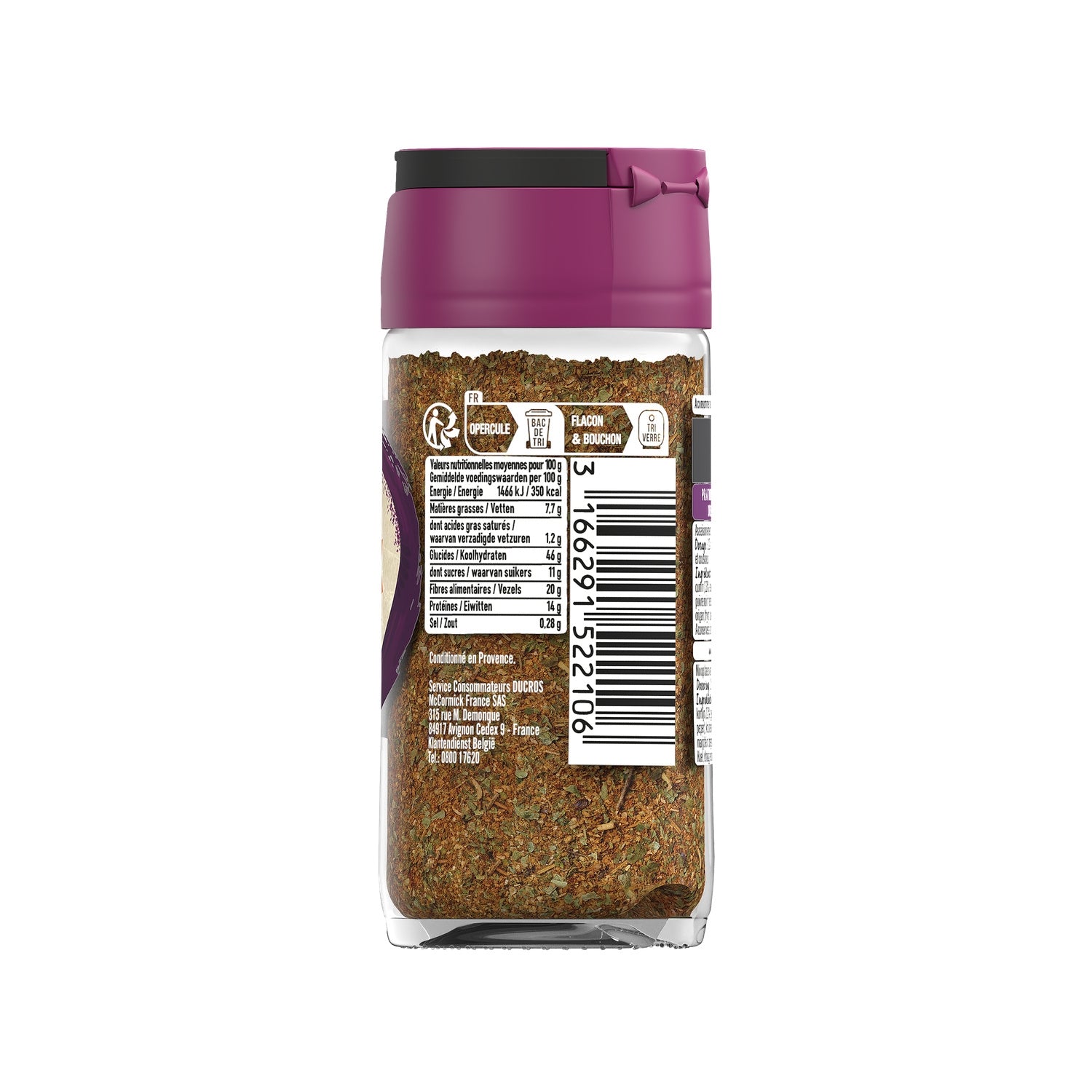 Ingrédients : epices (oignon déshydraté (24%), ail déshydraté, cumin (12%), échalote déshydratée, paprika, poivron rouge, gingembre, poivre noir), herbes (persil (9%), romarin, sarriette, basilic, marjolaine, origan, thym), huile d'olive vierge extra.