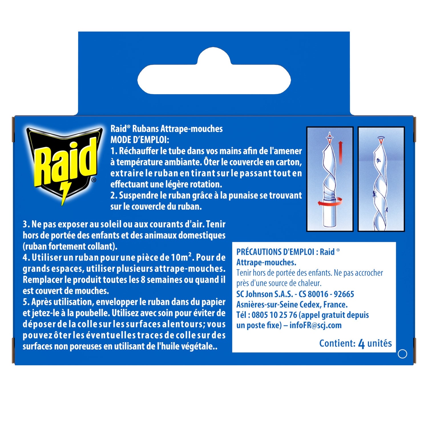 Les attrape-mouches Raid® neutralisent les mouches et autres insectes volants grâce à leur surface adhésive.,La formule de ce produit ne contient aucun insecticide.,Ces rubans anti-mouches offrent jusqu'à 6 semaines d'efficacité pour une protection longue durée.,Pouvant être utilisé dans toutes les pièces de la maison, ce piège autocollant anti-mouches vous aidera à vous débarrasser des mouches de manière efficace.,Utilisez les produits répulsifs avec précaution. Avant toute utilisation, lisez l'étiquette et les informations concernant le produit. MAN date sur nos emballages signifie date de fabrication du lot et non date de péremption
