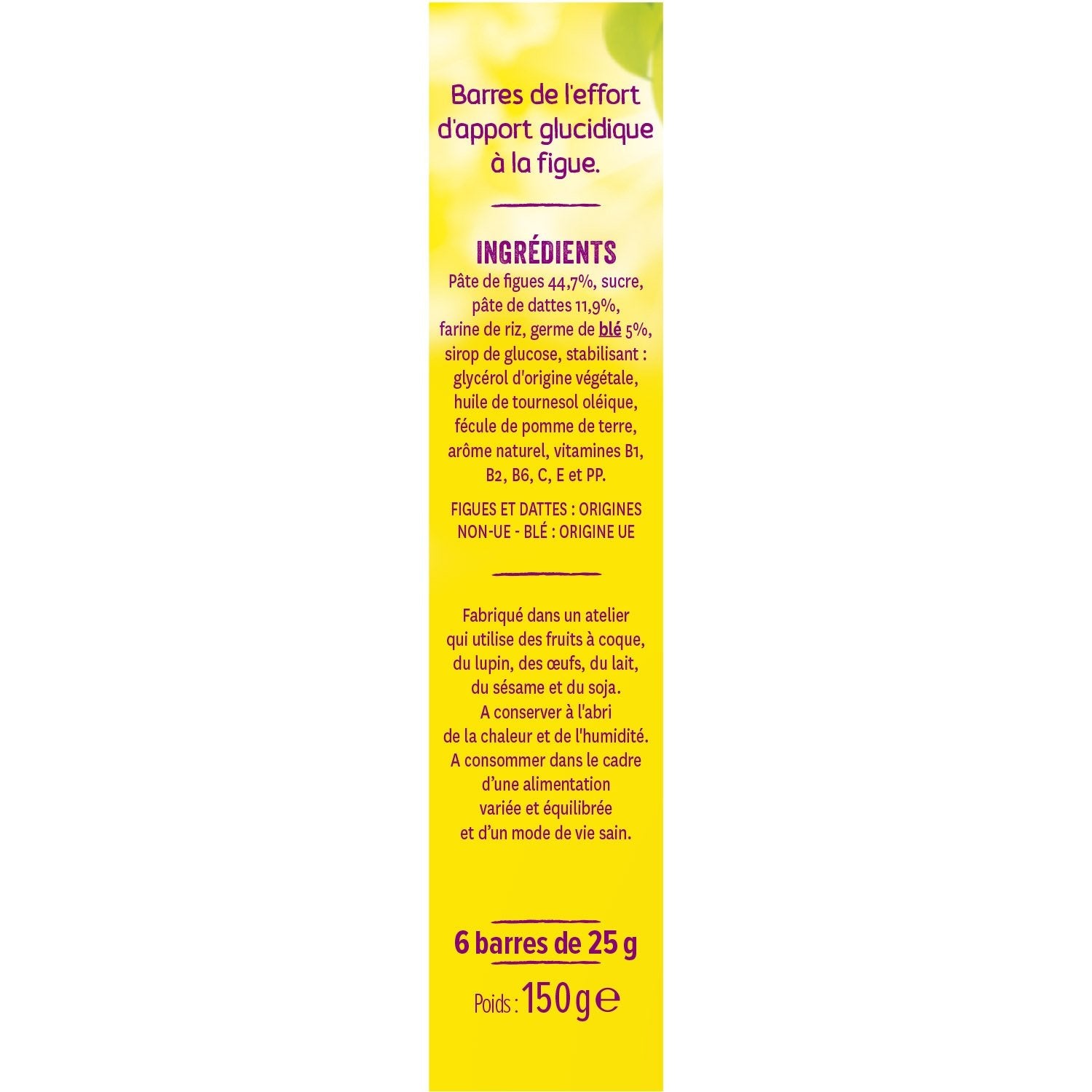 Pâte de figues 44,7%, sucre, pâte de dattes 11,9%, farine de riz, germe de BLE 5%, sirop de glucose, stabilisant : glycérol d'origine végétale, huile de tournesol oléique, fécule de pomme de terre, arôme naturel, vitamines (B1, B2, B6, C, E et PP). Fabriqué dans un atelier qui utilise FRUITS A COQUE, LAIT, LUPIN, MOUTARDE, OEUF, SESAME, SOJA