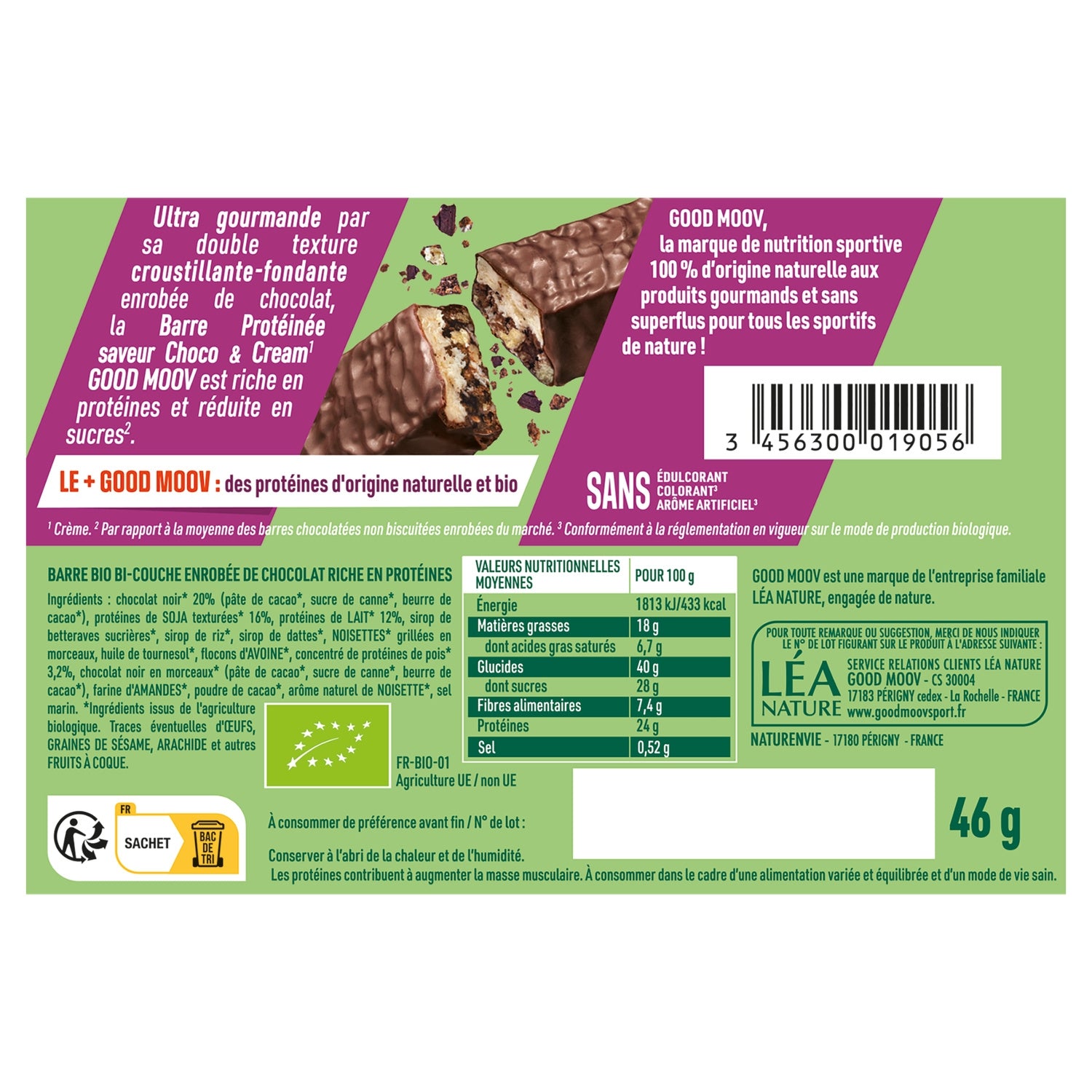 Ultra gourmande par sa double texture croustillante-fondante enrobée de chocolat, la Barre Protéinée saveur Choco & Cream GOOD MOOV est riche en protéines et réduite en sucres. Le + Good Moov : Des protéines d'origine naturelle et bio. Sans édulcorant, sans colorant, sans arôme artificiel Fabriqué en France Bio et 100% d'ingrédients d'origine naturelle 10g de protéines / barre -30% de sucres