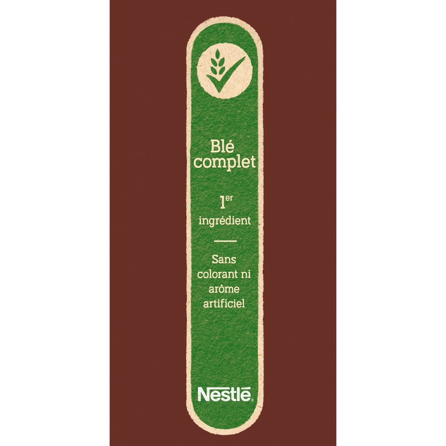 Ingrédients : farine de BLÉ complet 35,0 %, sirop de glucose, sirop de sucre inverti, chocolat en poudre 11,1 % (sucre, cacao en poudre*), huiles végétales (tournesol, coco, karité), humectants : sirop de sorbitol, glycérol ; LAIT écrémé en poudre 5,3 %, extrait de malt d'ORGE, carbonate de calcium, maltodextrine, semoule de maïs, sel, émulsifiant : lécithines ; farine de riz, cacao maigre en poudre*, antioxydant : extrait riche en tocophérols ; fer, vitamines B3, B5, B9, B6 et B2. Peut contenir des FRUITS A COQUE. *Bilan massique certifié Rainforest Alliance. www.ra.org/fr. Nestlé achète une quantité de cacao certifié Rainforest Alliance équivalente à celle nécessaire pour ce produit.