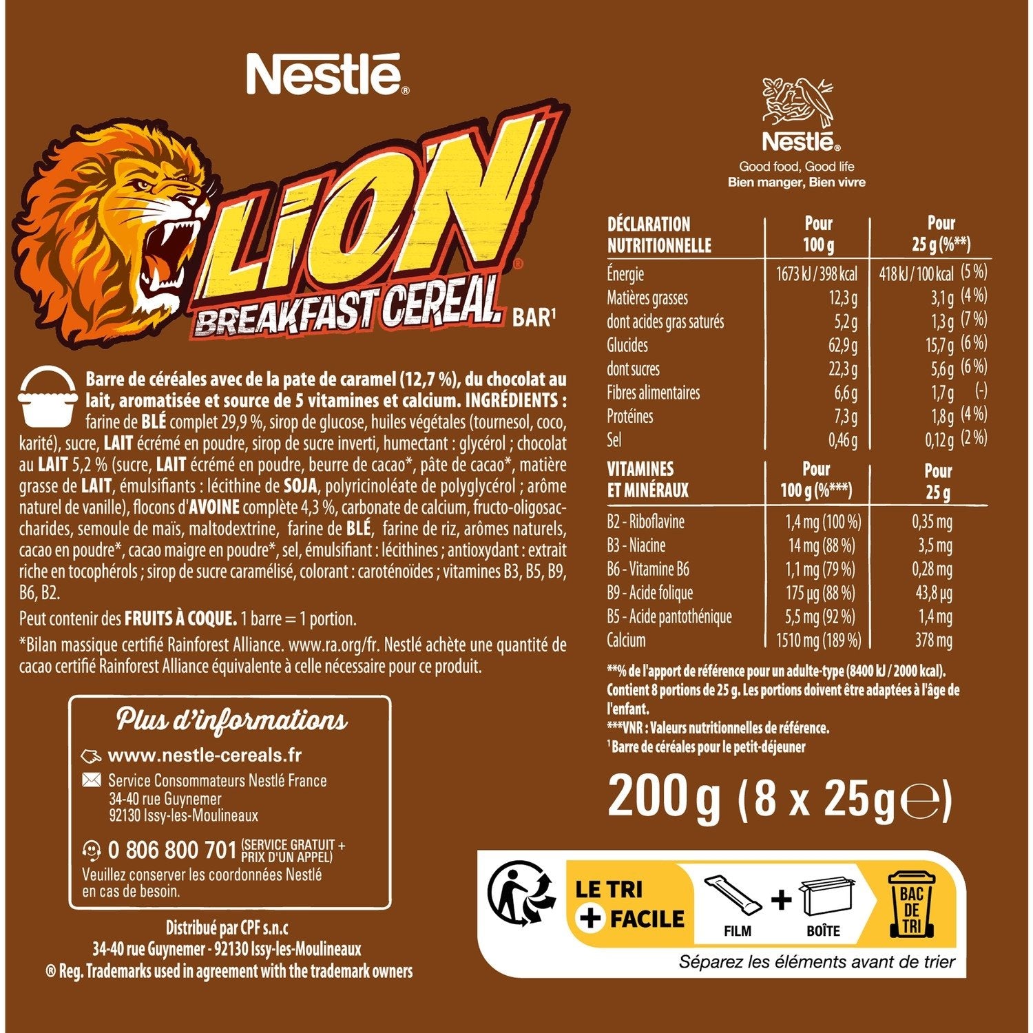 Découvrez les barres de céréales LION® en paquet de 8x25g pour encore plus de praticité ! Retrouvez le bon goût des céréales LION® à base de blé complet, de caramel et de chocolat, à emporter partout avec vous, pour le petit-déjeuner ou une petite pause gourmande. Les barres de céréales LION® de NESTLE® sont source de fibres et sans colorant ni arôme artificiel. Et pour varier les plaisirs, découvrez les barres NESQUIK®, CHOCAPIC® et GOLDEN GRAHAMS®.