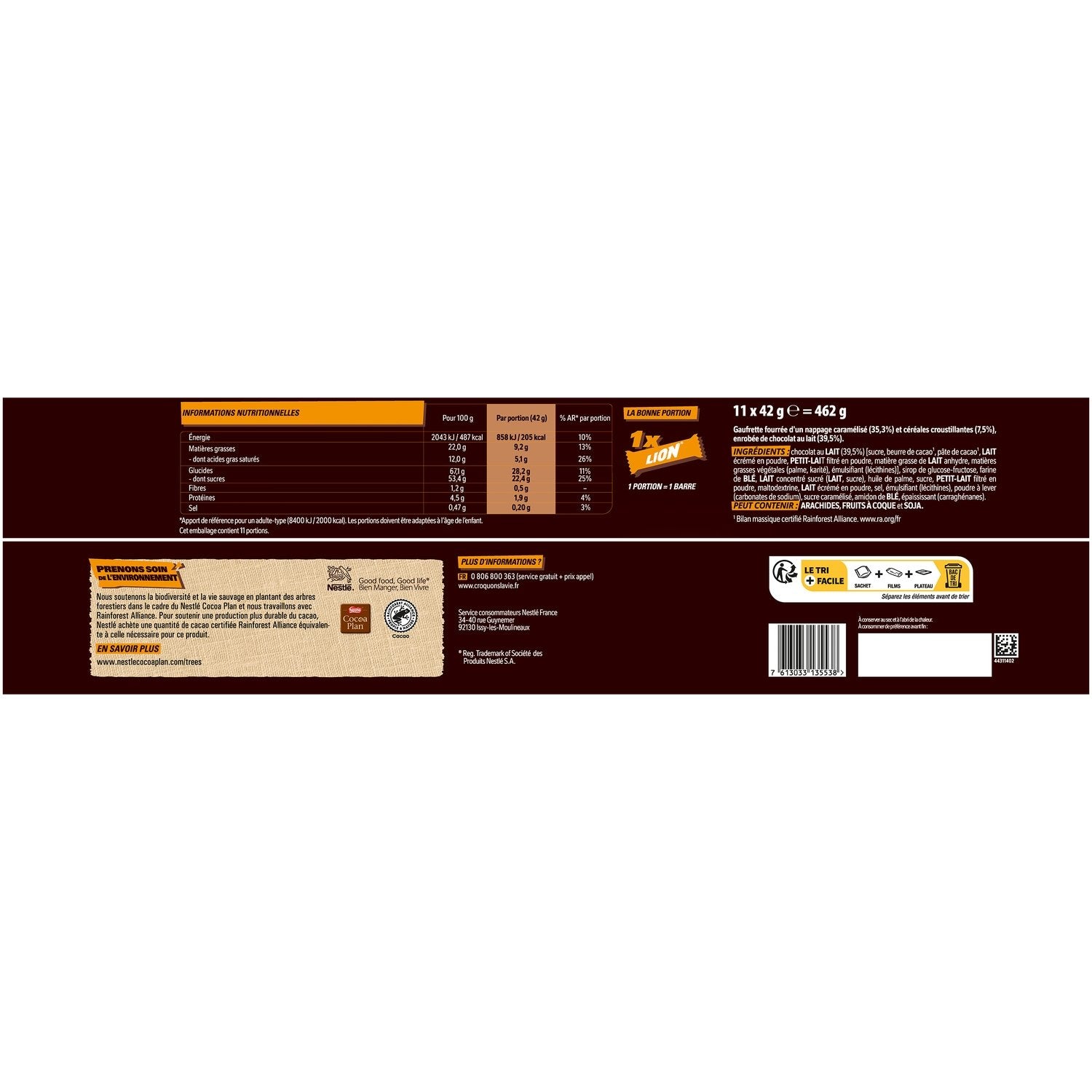 La barre chocolatée LION est la barre idéale pour s'accorder une pause gourmande ! Des céréales de blé extra croustillantes nappées d'un caramel fondant et d'un bon chocolat au lait pour vous faire rugir de plaisir ! La marque LION est née en Angleterre en 1979. Aujourd'hui elle existe en plusieurs formats et au goût Peanut*. *Cacahuète.