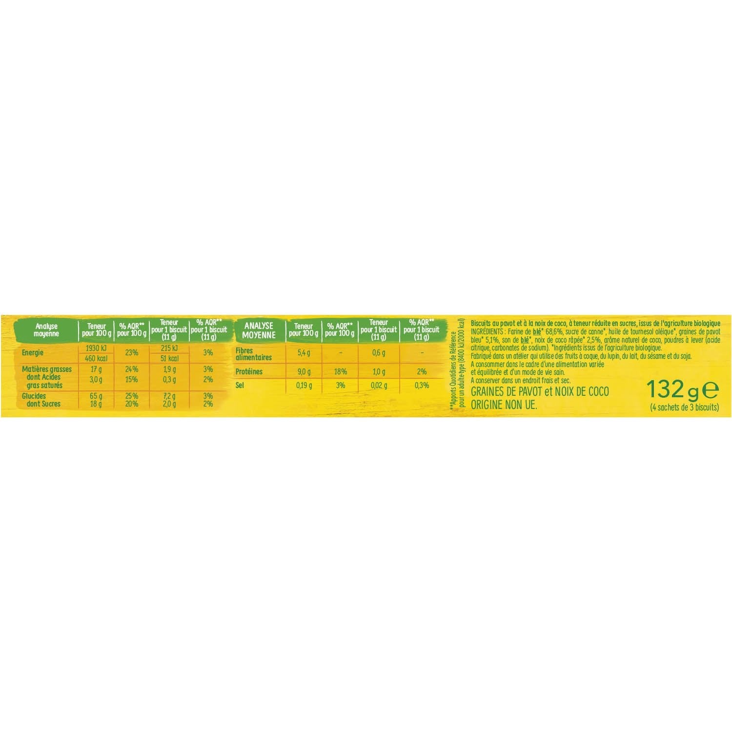 Biscuits au pavot et à la noix de coco, à teneur réduite en sucres, issus de l'agriculture biologique