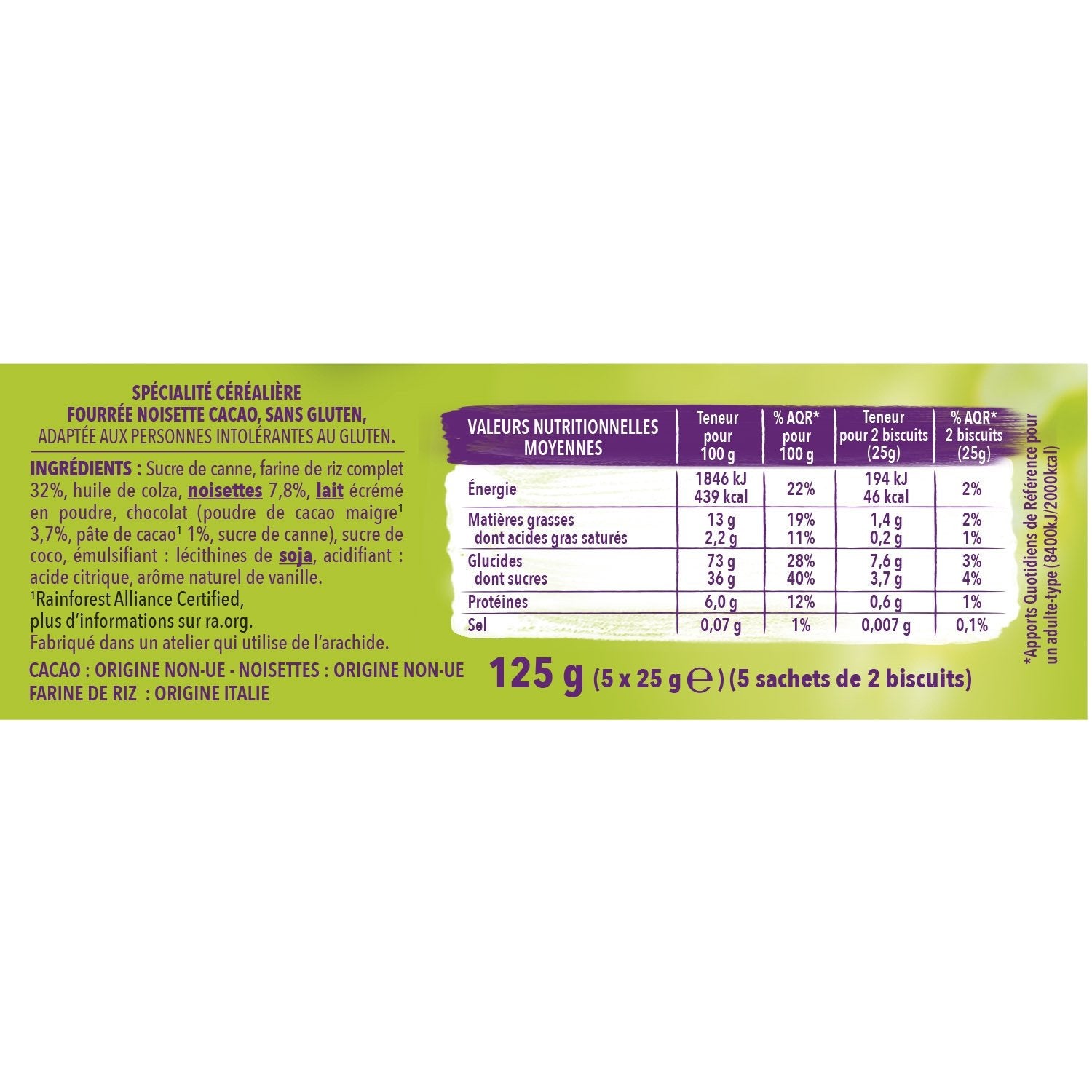 Farine de riz complet 39,2%, sucre, huile de colza, NOISETTES 7%, LAIT écrémé en poudre, chocolat (poudre de cacao1 maigre 3.4%, pâte de cacao 1 0.96%, sucre de canne), émulsifiant : lécithines (SOJA), acidifiant : acide citrique, arôme naturel de vanille, Fabriqué dans un atelier qui utilise ARACHIDE