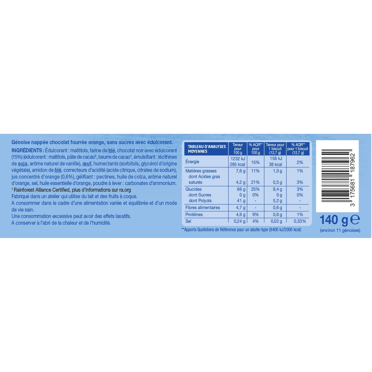 Edulcorant : maltitols, farine de BLE, chocolat noir avec édulcorant (15%) (édulcorant : maltitols, pâte de cacao1 , beurre de cacao1, émulsifiant : lécithines de SOJA, arôme naturel de vanille), OEUF, humectants (sorbitols, glycérol d'origine végétale), amidon de BLE, correcteurs d'acidité (acide citrique, citrates de sodium), jus concentré d'orange (0,6%), gélifiant : pectines, huile de colza, arôme naturel d'orange, sel, huile essentielle d'orange, poudre à lever : carbonates d'ammonium. Fabriqué dans un atelier qui utilise FRUITS A COQUE, LAIT