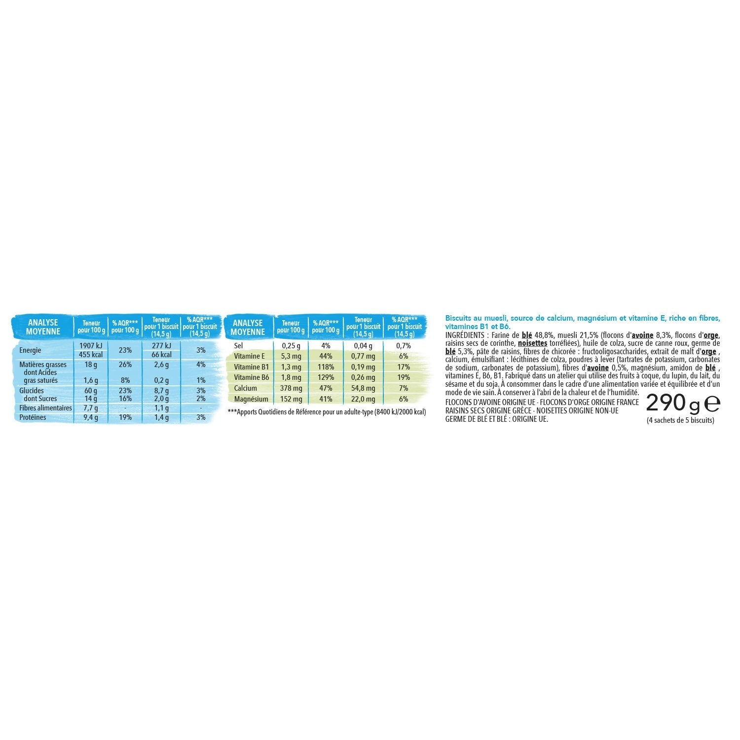 Farine de BLE 48,8%, muesli 21,8% (flocons d'AVOINE 8,3%, flocons d'ORGE, raisins secs de corinthe 3.6%, NOISETTES torréfiées 3.3%), huile de colza, sucre de canne roux, germe de BLE 5,3%, pâte de raisins thomson, fibres de chicorée, extrait de malt d'ORGE, calcium, émulsifiant : lécithines, poudres à lever (tartrates de potassium, carbonates de sodium, carbonates de potassium), fibres d'AVOINE 0,5%, magnésium, amidon de BLE, vitamines (E, B6, B1), Fabriqué dans un atelier qui utilise FRUITS A COQUE, MOUTARDE, LUPIN, LAIT, SESAME, SOJA