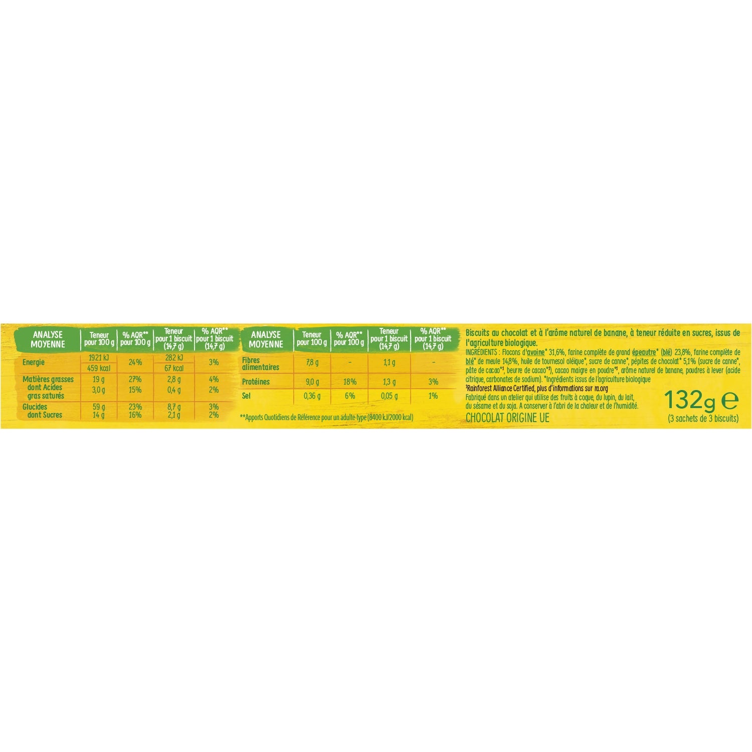 Flocons d'AVOINE* 31,6%, farine complète de grand épeautre* (BLE) 23,8%, farine complète de BLE* de meule 14,8%, huile de tournesol oléique*, sucre de canne*, pépites de chocolat* 5,1% (sucre de canne*, pâte de cacao*1 , beurre de cacao*1), cacao maigre en poudre*1, arôme naturel de banane, poudres à lever (acide citrique, carbonates de sodium), * Ingrédients issus de l'agriculture biologique Fabriqué dans un atelier qui utilise FRUITS A COQUE, LUPIN, LAIT, SESAME, SOJA