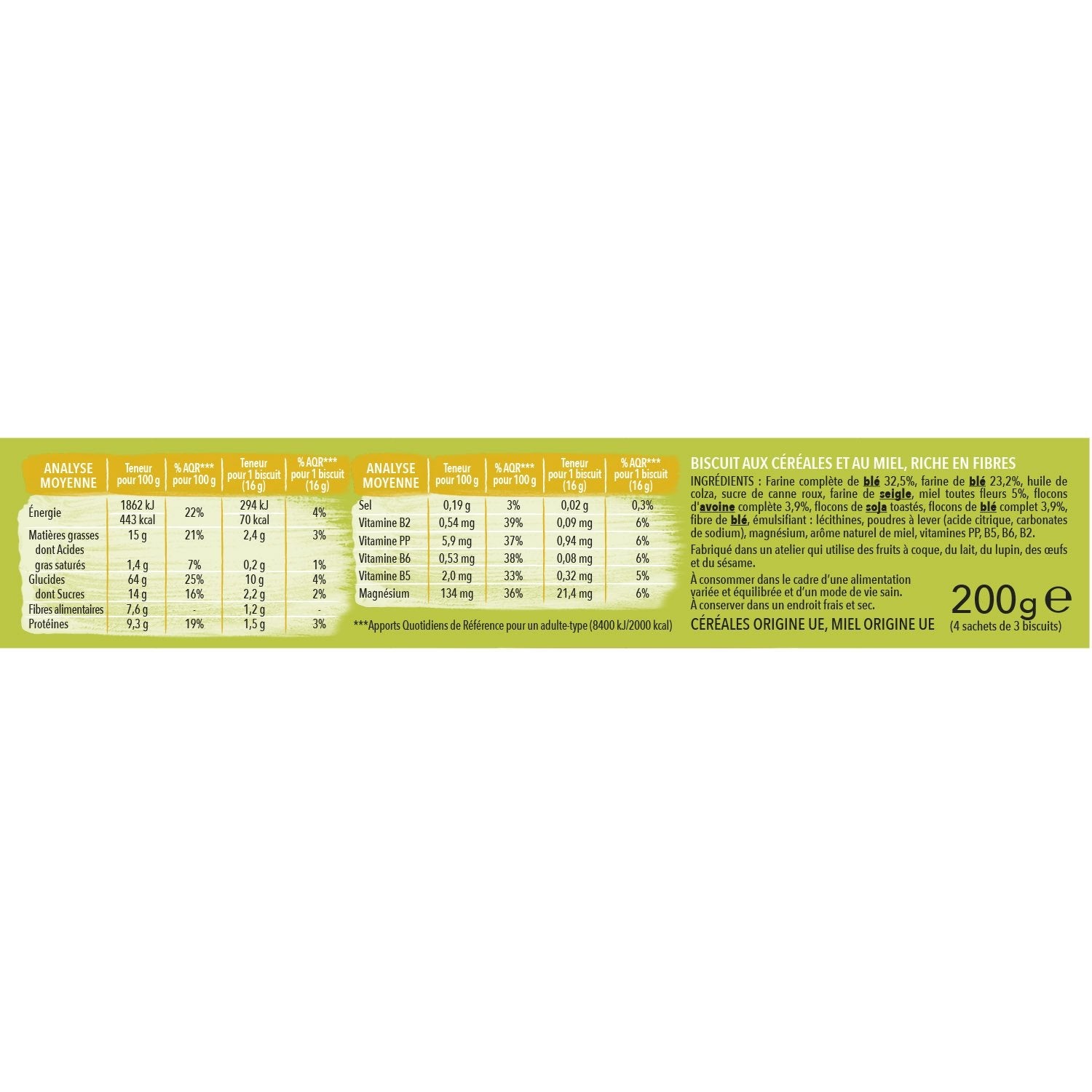 Biscuit aux céréales et au miel, riche en fibres, source de magnésium, vitamines B2, PP, B5, B6