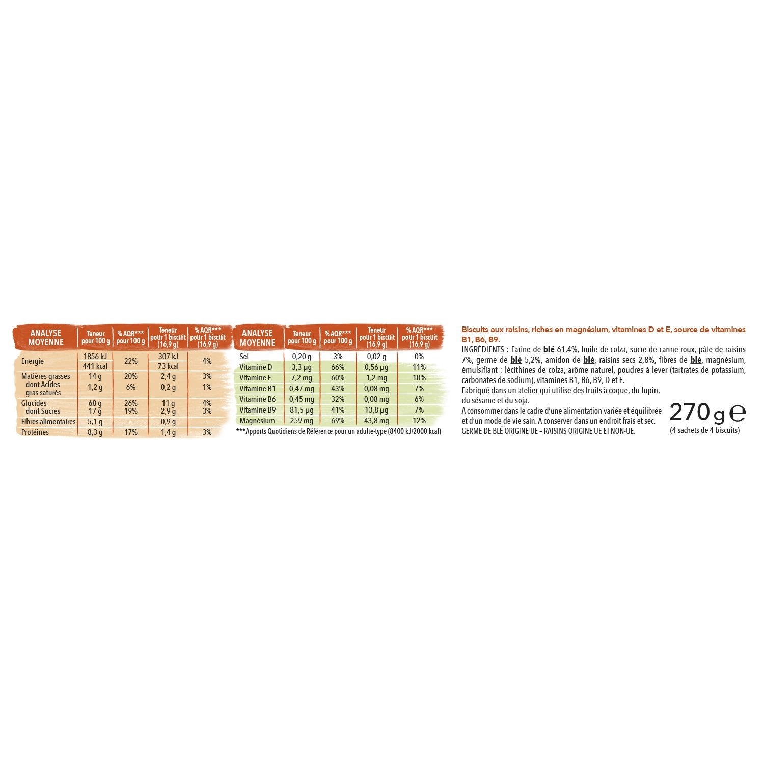 Farine de BLE 60,4%, huile de colza, sucre non raffiné, pâte de raisins 6,9%, germe de BLE 5,1%, amidon de BLE, raisins secs 2,8%, fibres de BLE, magnésium, émulsifiant : lécithines, poudres à lever (tartrates de potassium, carbonates de sodium), arôme naturel, vitamines (B1, B6, B9, D, E). Fabriqué dans un atelier qui utilise FRUITS A COQUE, LAIT, LUPIN, MOUTARDE, SESAME, SOJA