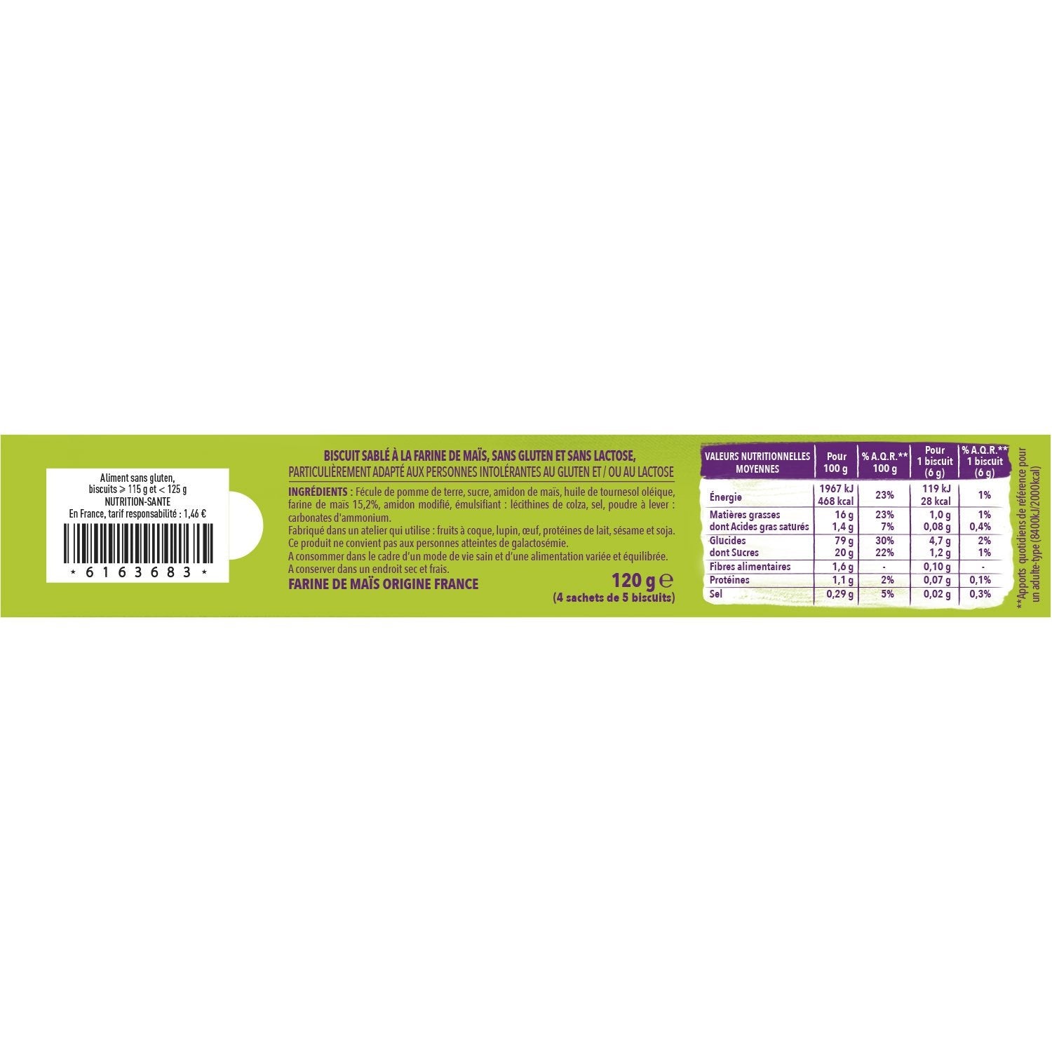 Biscuit sablé à la farine de maïs sans gluten et sans lactose, particulièrement adapté aux personnes intolérantes au gluten et / ou au lactose