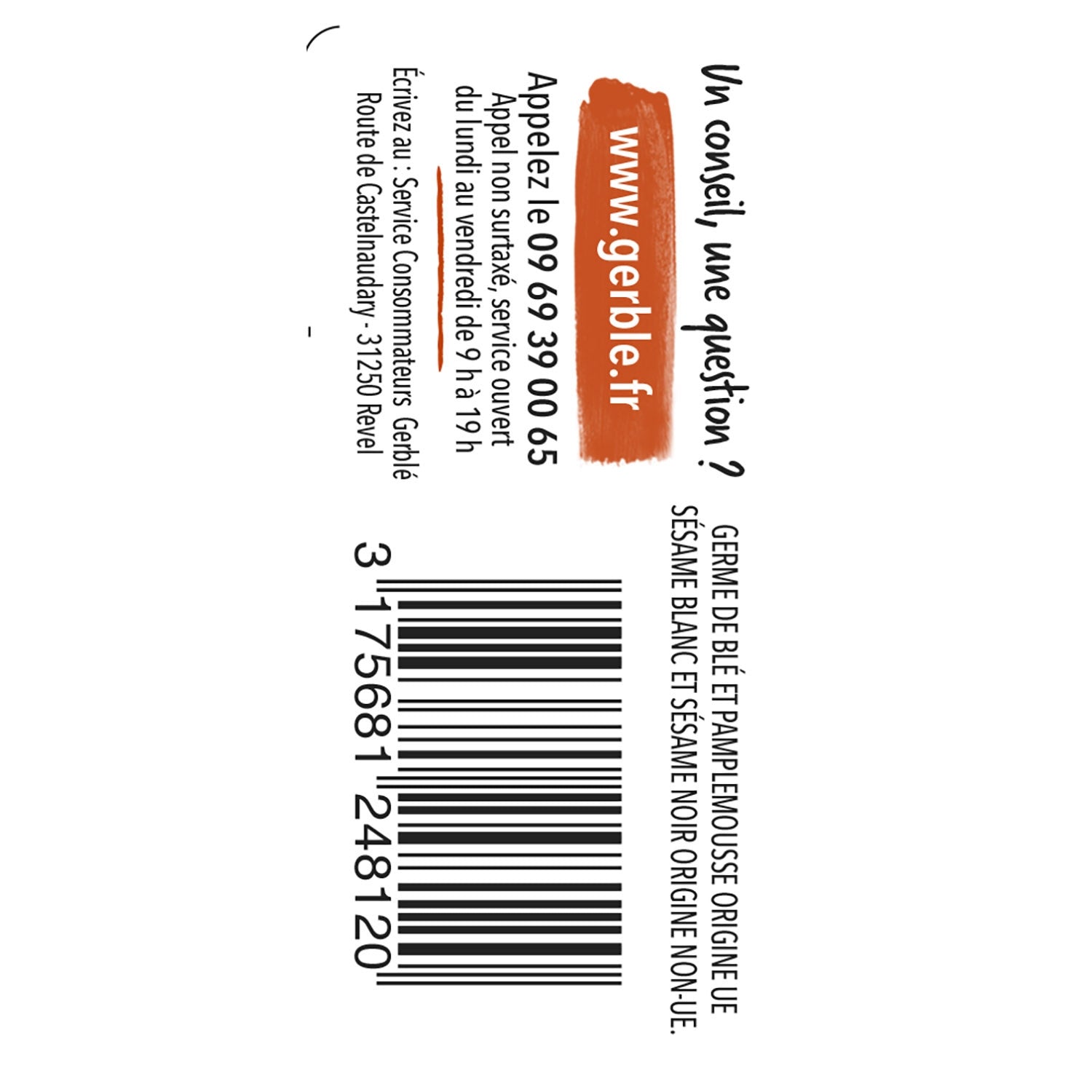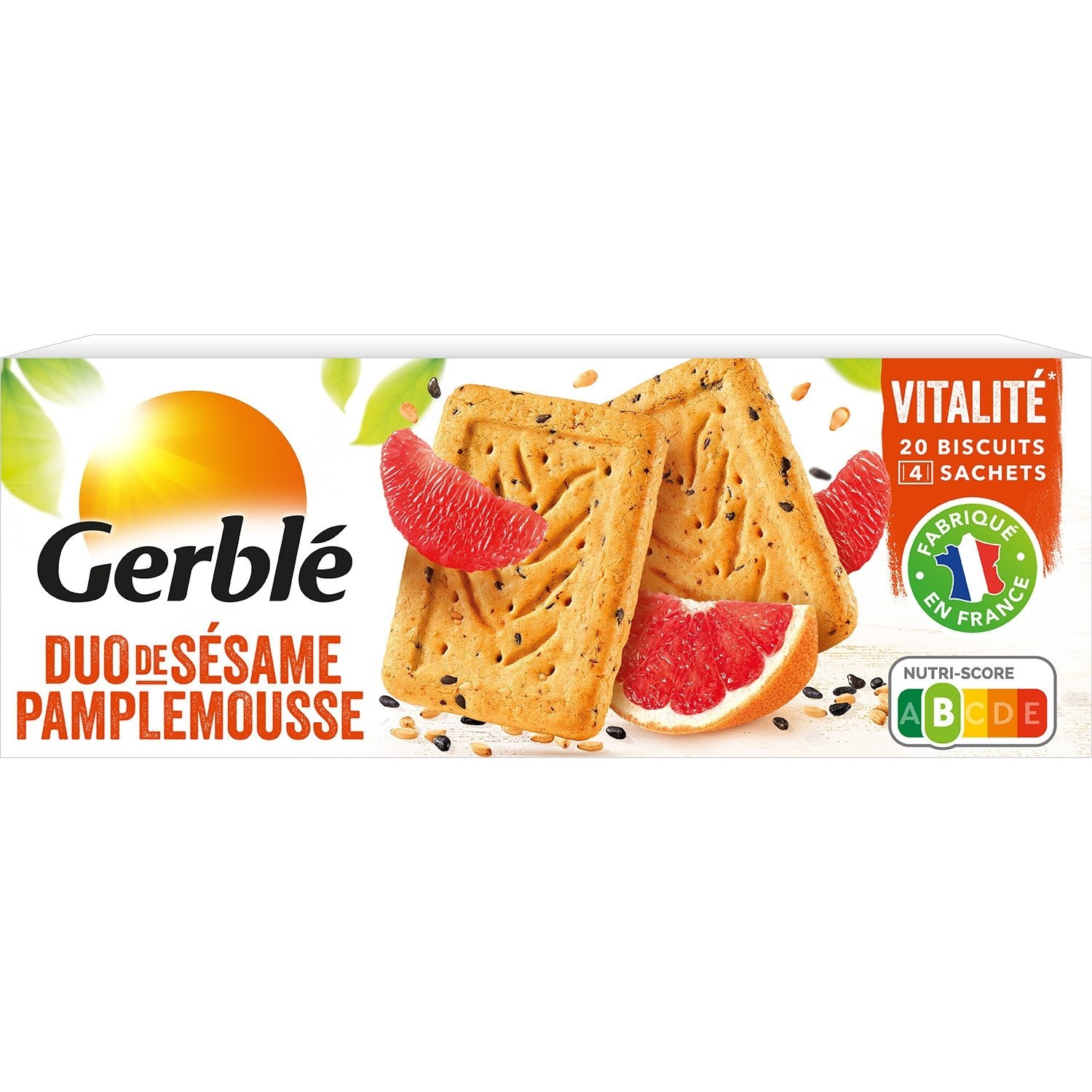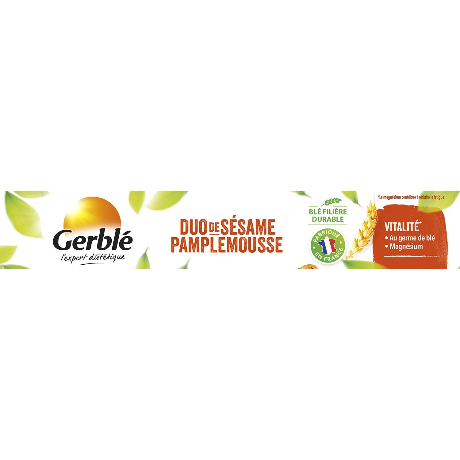 Farine de BLE 57,4%, huile de colza, sucre de canne roux, germe de BLE 5,5%, amidon de BLE, fibres de BLE, SESAME noir 3,3%, SESAME toasté 2%, pamplemousse rose avec écorces déshydraté 0,9%, oranges déshydratées 0,72%, jus concentré de citron, émulsifiant : lécithines, magnésium, sucre, arôme naturel de pamplemousse, amidon, sel de mer, poudre à lever (carbonates de sodium), arôme naturel, vitamines B1, B6, B9, D et E Fabriqué dans un atelier qui utilise FRUITS A COQUE, LAIT, LUPIN, MOUTARDE, SOJA