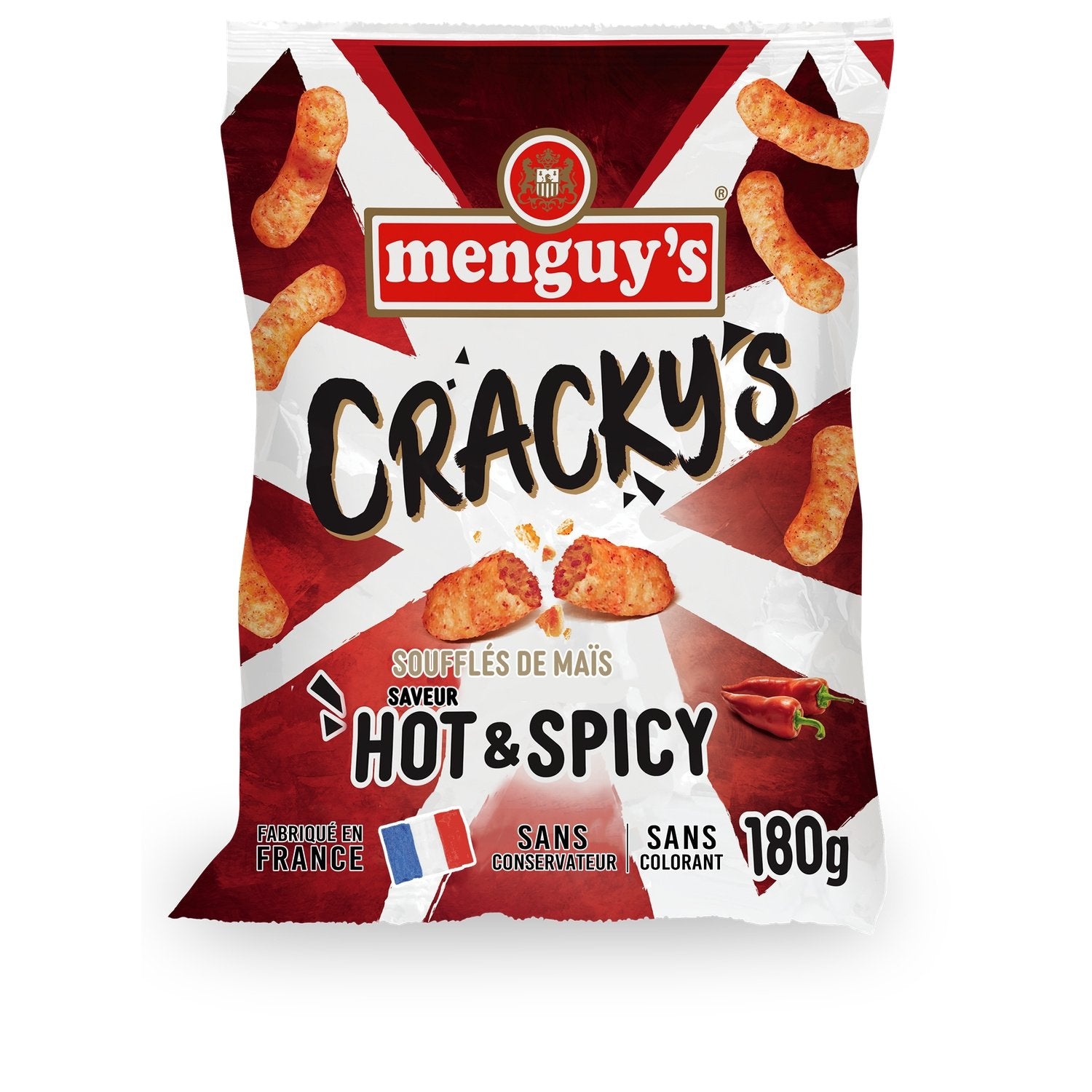Ces biscuits soufflés sont fabriqués à partir de maïs 100% français (sans OGM). Ils ont une texture légère et croustillante et un goût épicé et pimenté. Sans conservateur, sans colorant. Fabriqué en France dans notre usine (Mazamet, 81).