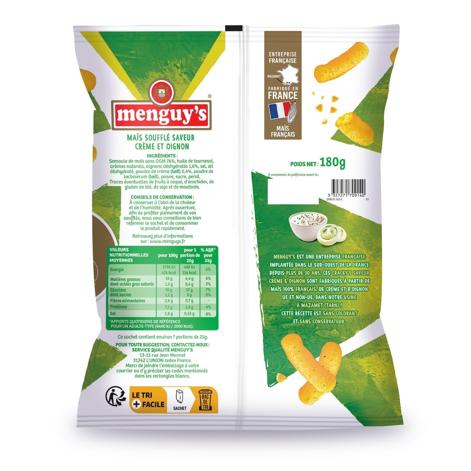 De délicieux biscuits soufflés à la texture légère et croustillante et un bon goût de Crème & Oignon, fabriqués à partir de maïs 100% français (sans OGM). Sans conservateur, sans colorant. Fabriqué en France dans notre usine (Mazamet, 81).