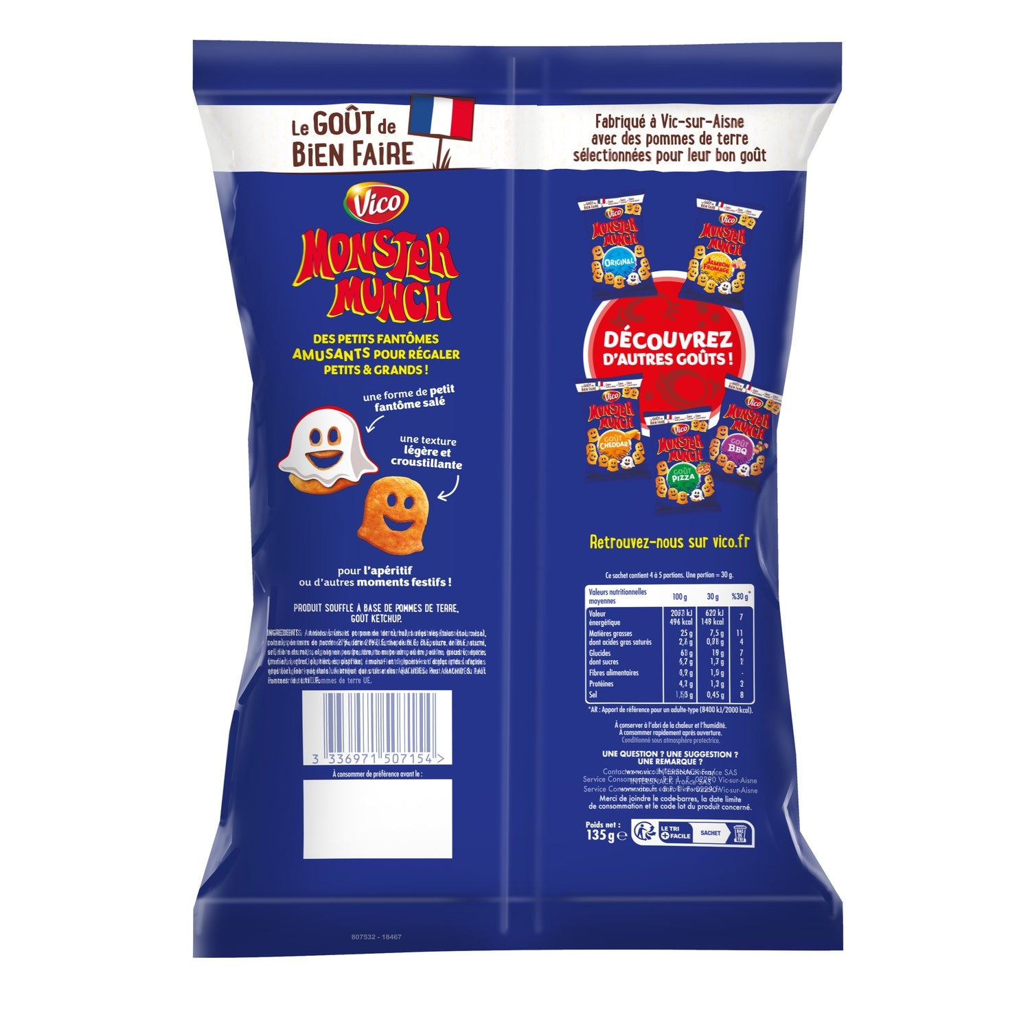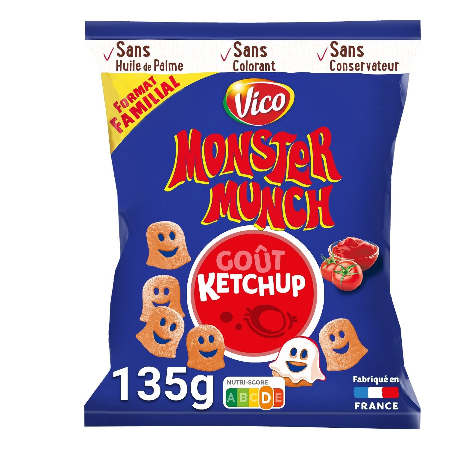 Petits monstres saveur Ketchup au bon goût de pomme de terre. D'une texture légère et croustillante, les Monster Munch peuvent être dégustés en différentes occasions. A l'apéritif en compagnie des parents ou lors d'un petit creux après le sport, ils seront aussi appréciés comme accompagnement en complément d'un repas équilibré.