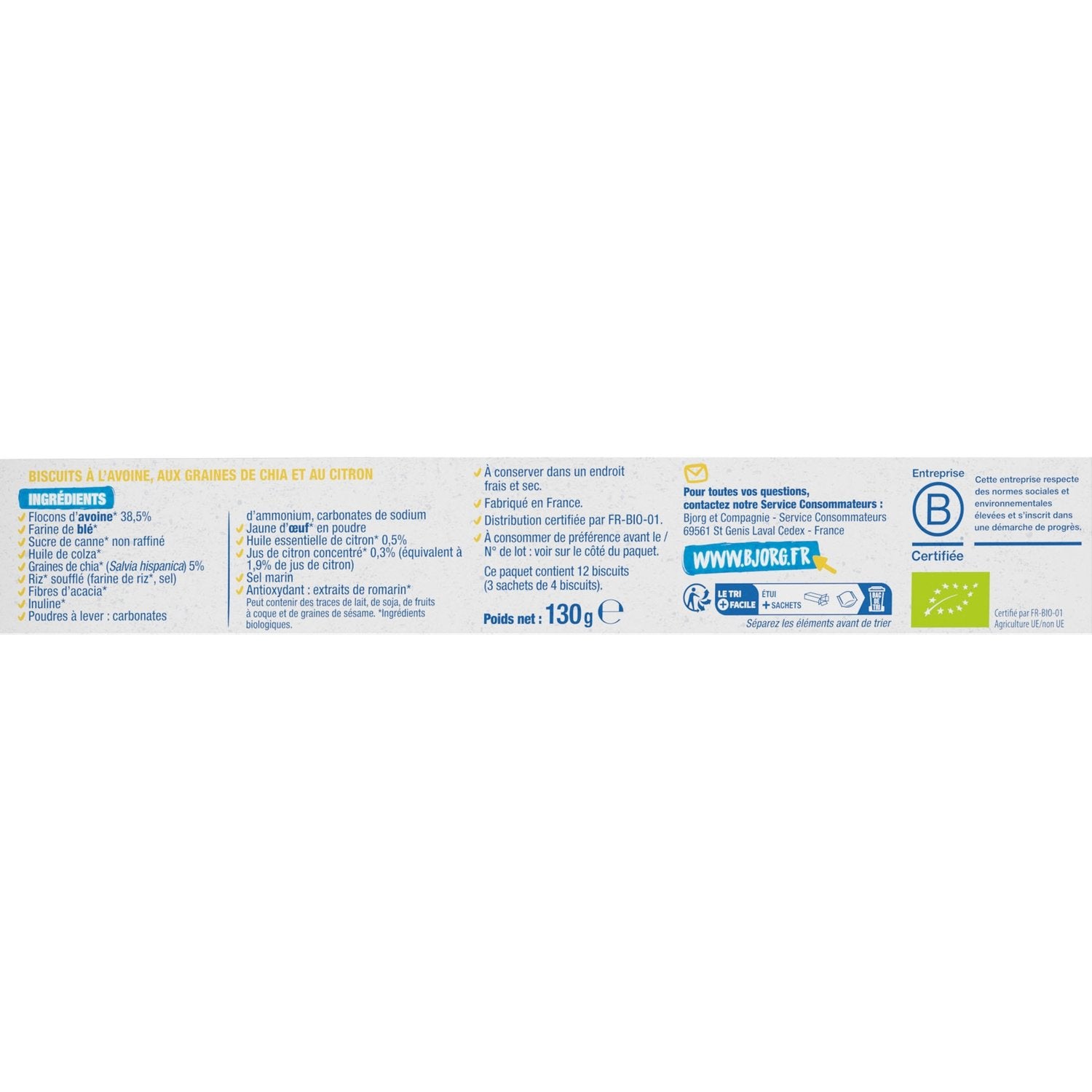 FLOCONS D'AVOINE* 38,5%, farine de BLÉ*, sucre de canne* non raffiné, huile de colza*, graines de chia* (Salvia hispanica) 5%, riz* soufflé (farine de riz*, sel), fibres d'acacia*, inuline*, poudres à lever : carbonates d'ammonium, carbonates de sodium; jaune d'ŒUF* en poudre, huile essentielle de citron* 0,5%, jus de citron concentré* 0,3% (équivalent à 1,9% de jus de citron), sel marin, antioxydant : extraits de romarin*. *Ingrédients biologiques